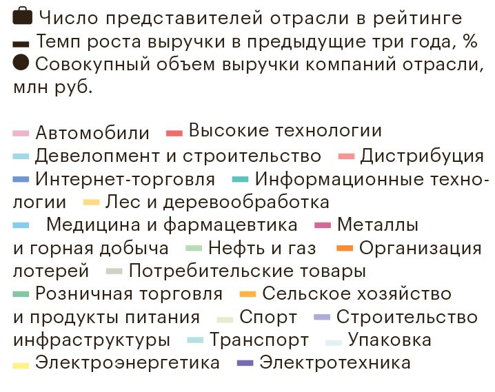 Абсолютный лидер всех рейтингов быстрорастущих компаний журнала РБК среди отраслей — розничная торговля. Представители этой отрасли лидировали в каждом рейтинге по числу представителей отрасли и почти всегда — по совокупной выручке. Последнее объясняется еще и тем, что в рейтинги попадают лидеры этой отрасли, огромные компании вроде «Ленты» или X5 Retail Group, лидеры других отраслей не растут так быстро. Лишь однажды, в 2016 году, лидером по совокупной выручке компаний отрасли стал сектор «нефть и газ», и то благодаря всего двум компаниям — «Северэнергии» (позже стала частью «Арктикгаза») и Антипинскому НПЗ (вошел в «Новый поток»).