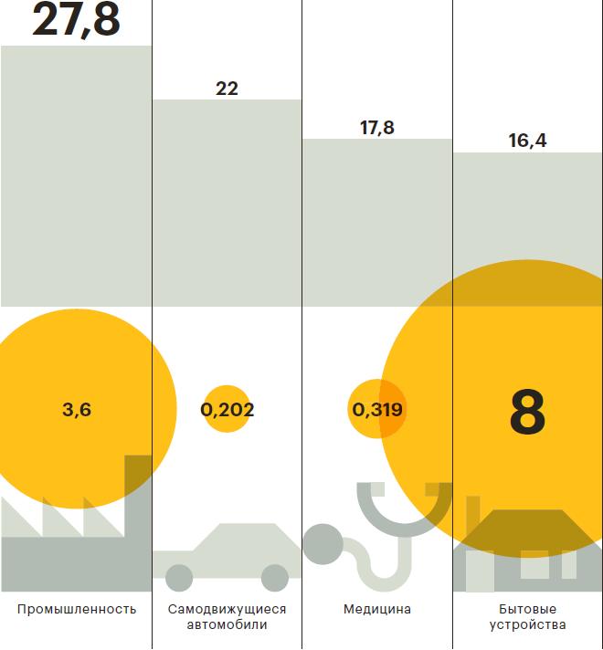 Мировой рынок IoT в 2017 году превысит отметку $800 млрд, а к 2020-му достигнет $1,29 трлн, прогнозируют эксперты исследовательского агентства IDC. В эти цифры входят затраты организаций на оборудование, услуги, связь и софт в этой сфере. Наиболее емкие сферы применения — промышленность ($185 млрд), транспорт ($85 млрд) и инженерные системы ($66 млрд).