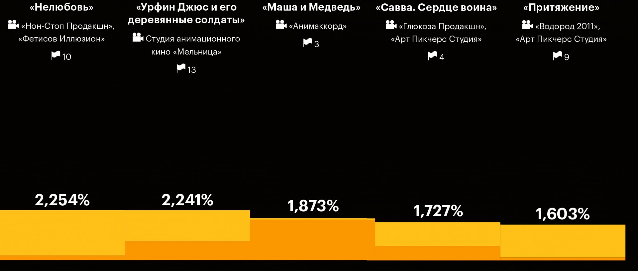Кассовые рекорды российского кино на родине в последние годы затмили еще одну важную тенденцию — востребованность отечественной кинопродукции за рубежом. Вопреки стереотипам о низком качестве продукта сборы российских фильмов в зарубежном прокате в последние два года резко выросли — в 2016-м и 2017-м совокупный боксофис последовательно брал планку в $40 млн. С 2015-го этот показатель подскочил в четыре раза. Число российских фильмов в прокате за три года увеличилось на 44%, с 43 картин в 2015-м до 62 в 2017‑м. Журнал РБК изучил статистику, свидетельствующую о пока не сравнимых с Голливудом (до 80% бокс-офиса американских блокбастеров в последние годы приходится на зарубежные рынки), но уже ощутимых успехах российских фильмов за границей. Материал основан на данных доклада «Российская киноиндустрия — 2017», составленном Фондом кино и компанией InterMedia.