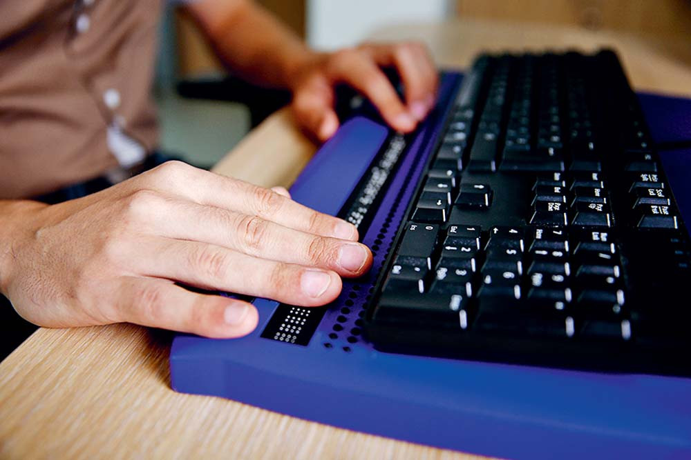 Дисплей предназначен для вывода информации с компьютера или смартфона. По габаритам он напоминает обычную клавиатуру, но вместо стандартных клавиш оборудован брайлевской строкой. Символы выступают над плоской поверхностью и меняются в зависимости от текста, который выводится. Как и обычный текст, написанный азбукой Брайля, пользователь читает его тактильно. Для работы с дисплеем необходим скринридер — именно он передает информацию на дисплей.