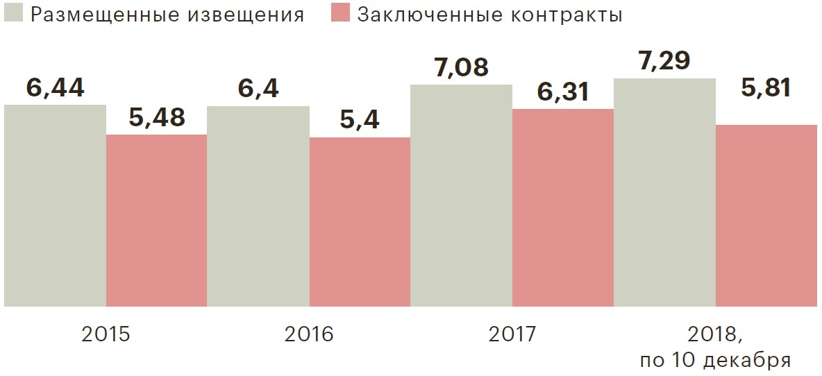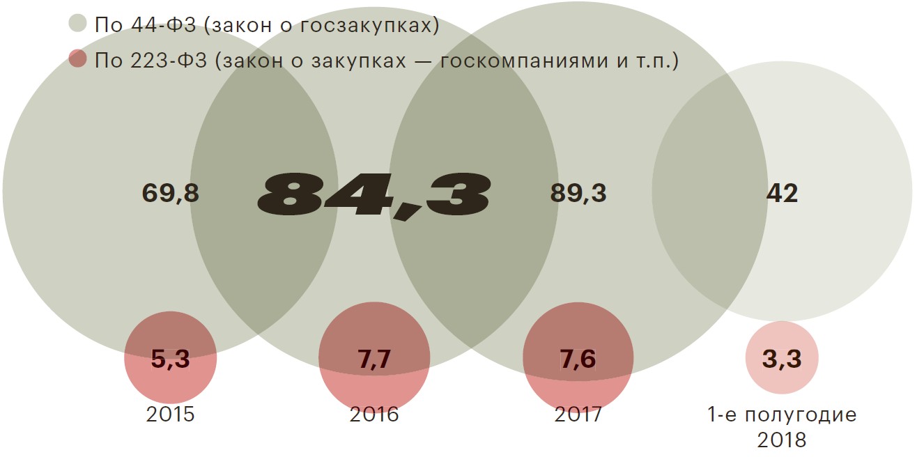 По данным статистики на портале госзакупок, в 2017 году в России было заключено более 3,5 млн контрактов на сумму 6,31 трлн руб. — в деньгах этот рынок вырос на 17% по сравнению с предыдущим годом, указано в сводном аналитическом отчете ФАС. В том же 2017 году в антимонопольную службу поступило почти 97 тыс. жалоб на госзакупки по 44-ФЗ и 223-ФЗ (для сравнения — в 2015 году их было 75 тыс.)
