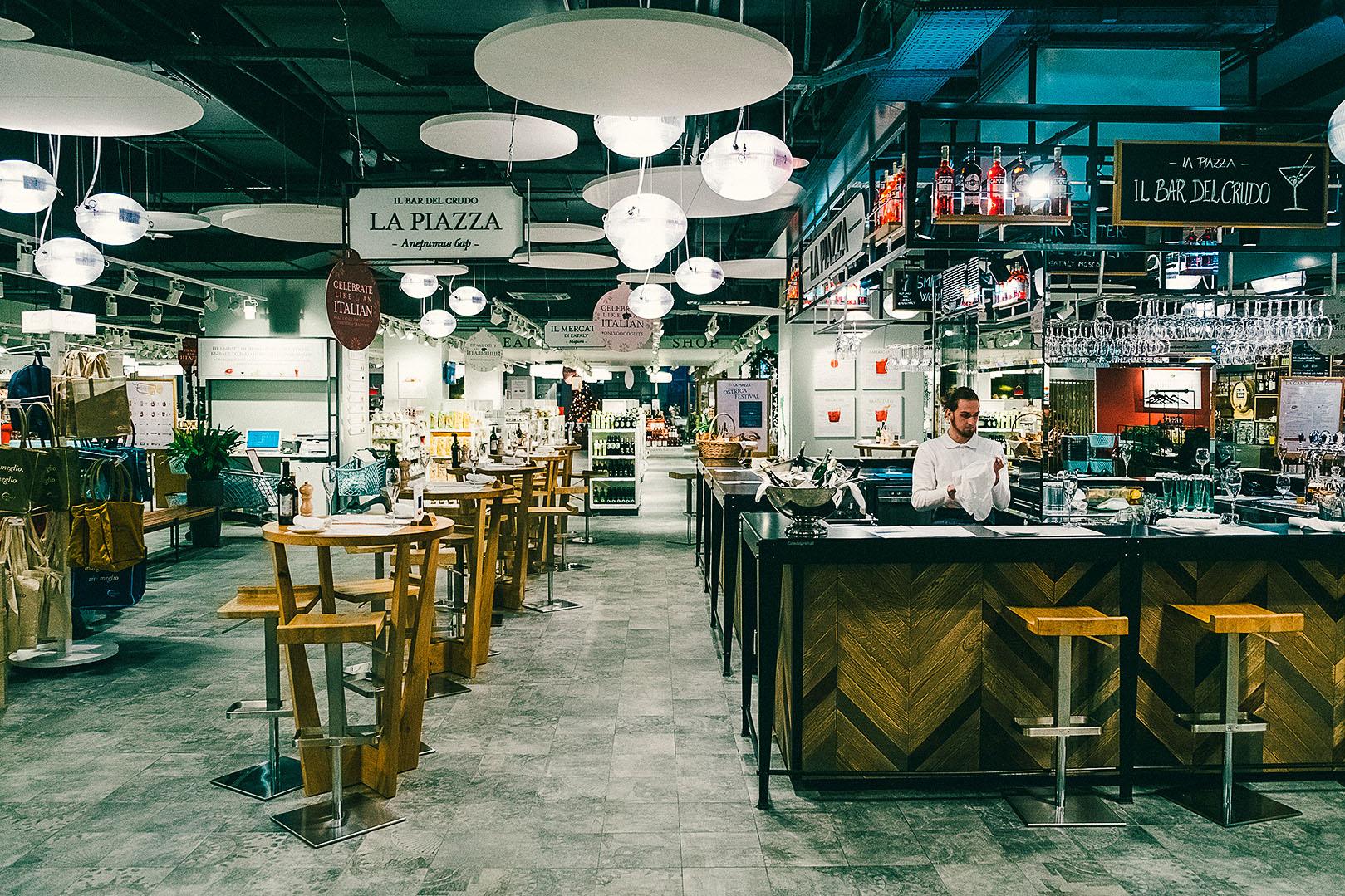 Вечером в будний день перед Новым годом, на последней неделе декабря, в Eataly немноголюдно. По выходным обычно больше посетителей, уверяет директор по маркетингу компании Дмитрий Павлов. Центр с ресторанами и супермаркетом открылся в мае 2017 года в торговом центре «Киевский», построенном на месте снесенной гостиницы с тем же названием, заняв почти весь четвертый этаж и площадь 7,5 тыс. кв. м.