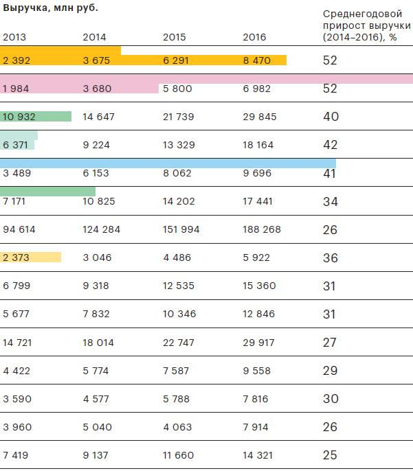 Как и в основном рейтинге, главной по деньгам является розничная торговля — 66% совокупной выручки 15 самых быстрорастущих иностранных «дочек» в 2016 году. Большая часть выручки сектора и почти половину всей совокупной выручки заработала компания «Леруа Мерлен Восток», управляющая гипермаркетами товаров для строительства и ремонта. На втором месте с большим отрывом — сектор ИT, представленный российскими подразделениями Google и Honeywell. На третьем — единственная в своем секторе сеть KFC.