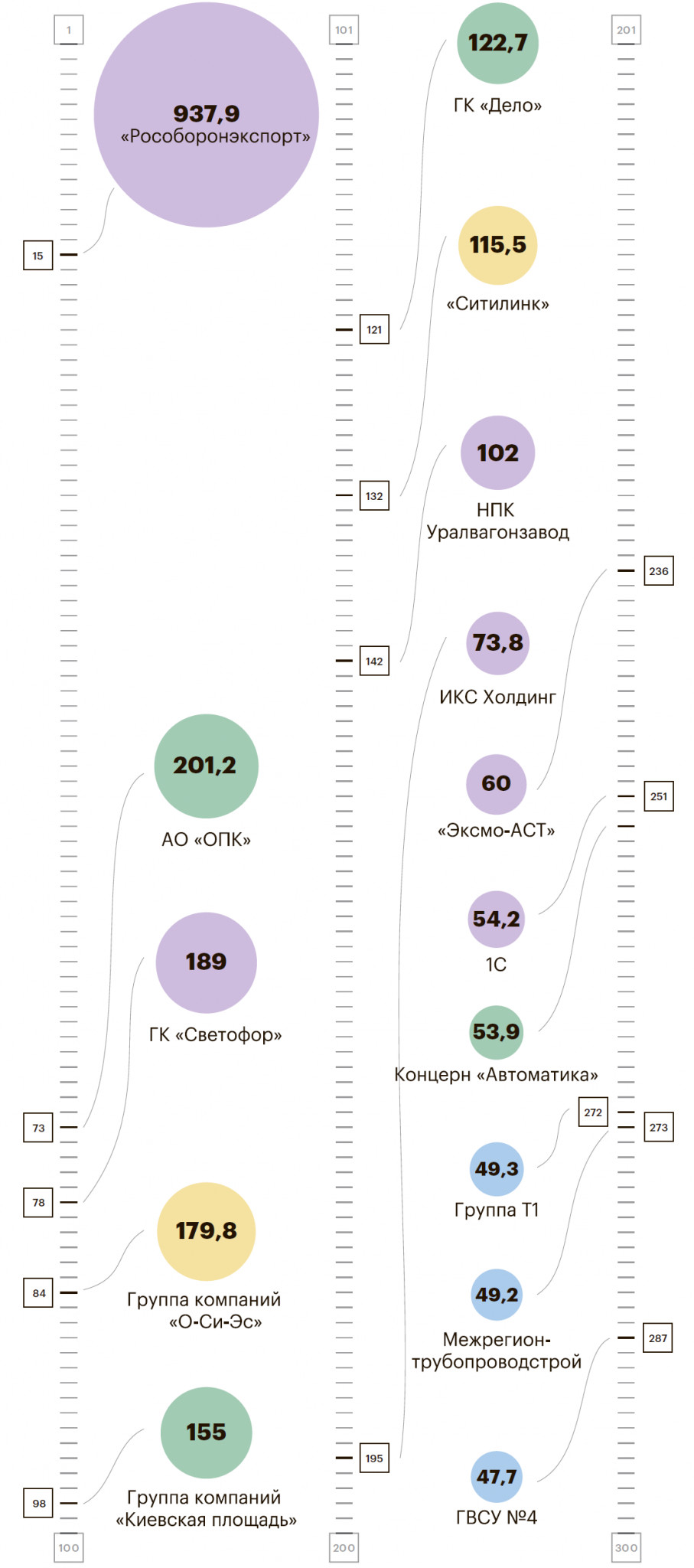 Наивысшая позиция новичка — 15. На эту строчку попал включенный нами в рейтинг «Рособоронэкспорт» — единственная в России государственная организация по экспорту всего спектра продукции, услуг и технологий военного и двойного назначения. Компания не публикует финансовую отчетность, но в прессе были названы объемы экспорта, осуществленного компанией. С учетом уникальности компании и роли для экономики мы включили ее в состав рейтинга РБК 500 по этому показателю.