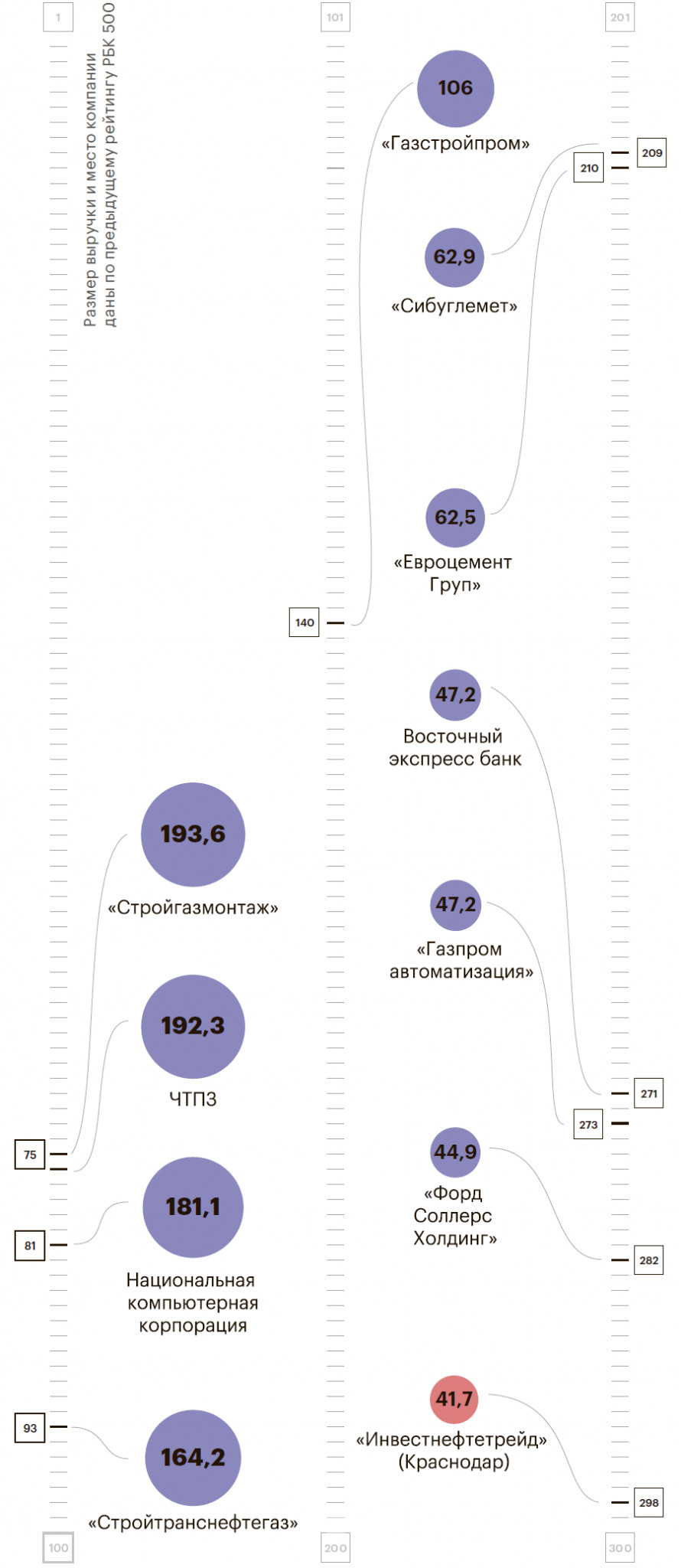 Как всегда, основной причиной вхождения в рейтинг и выбытия из его списка остается динамика выручки. Рейтинг покидают те компании, чья выручка снижается ниже порога вхождения (в этом году — 23,84 млрд руб.). С другой стороны, рейтинг пополняется теми, чья выручка выросла до размеров, необходимых для попадания в рейтинг.