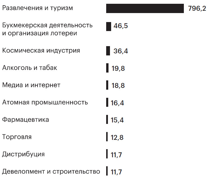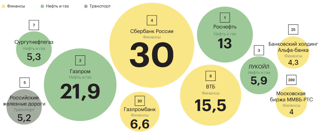 В топ-20 — двенадцать государственных компаний, в топ-40 их пятнадцать, а в топ100 — тридцать. То есть плотность госкомпаний размывается по мере продвижения вниз по рейтингу, но самые крупные компании — преимущественно государственные. Последние оценки доли государства в создании валовой добавленной стоимости в России находятся в диапазоне 25–45%, в создании рабочих мест — около 30% (с учетом неформальной занятости), указывает Дмитрий Куликов из АКРА. Государство имеет значительное присутствие в стратегически важных отраслях экономики (нефтегазовой, оборонной и т.д.), в сегменте естественных монополий, в финансовом секторе, в предоставлении общественных услуг. «Если смотреть на опыт других развивающихся и развитых рынков, в России пространство для снижения роли государства в экономике, скорее всего, может быть оценено в нескольких процентных пунктах ВВП (максимум 10 п.п.). Эта возможность периодически находит отражение в государственных программах и даже бюджете, но фактически очень слабо реализуется, так как находится на пересечении очень многих интересов», — констатирует Куликов.