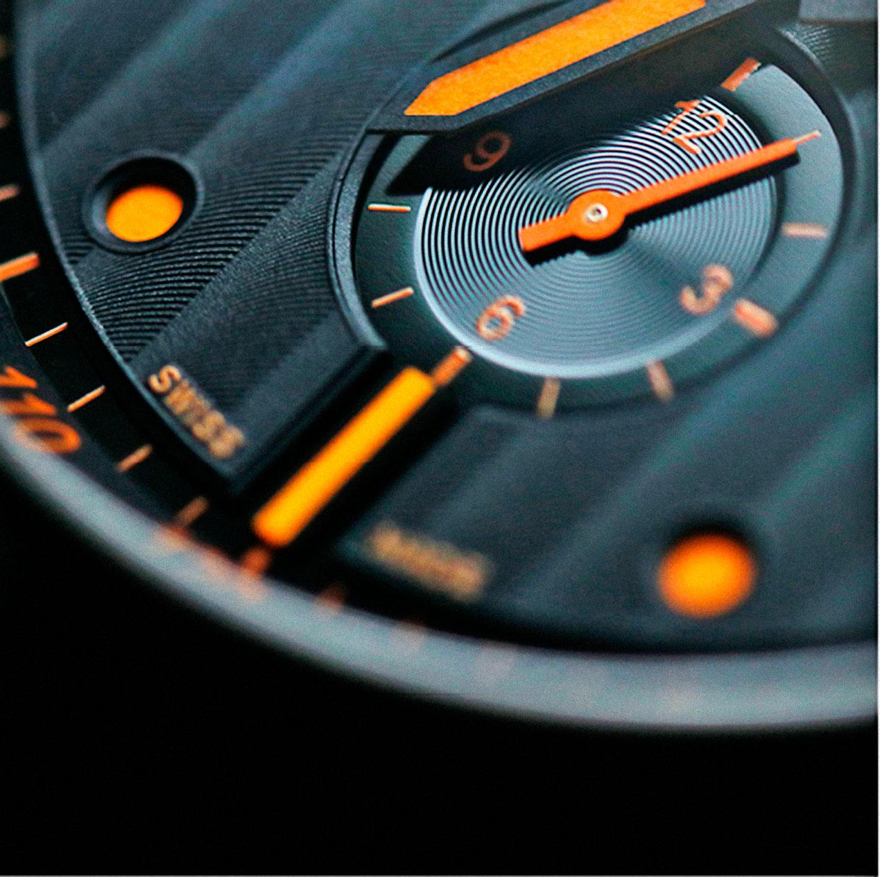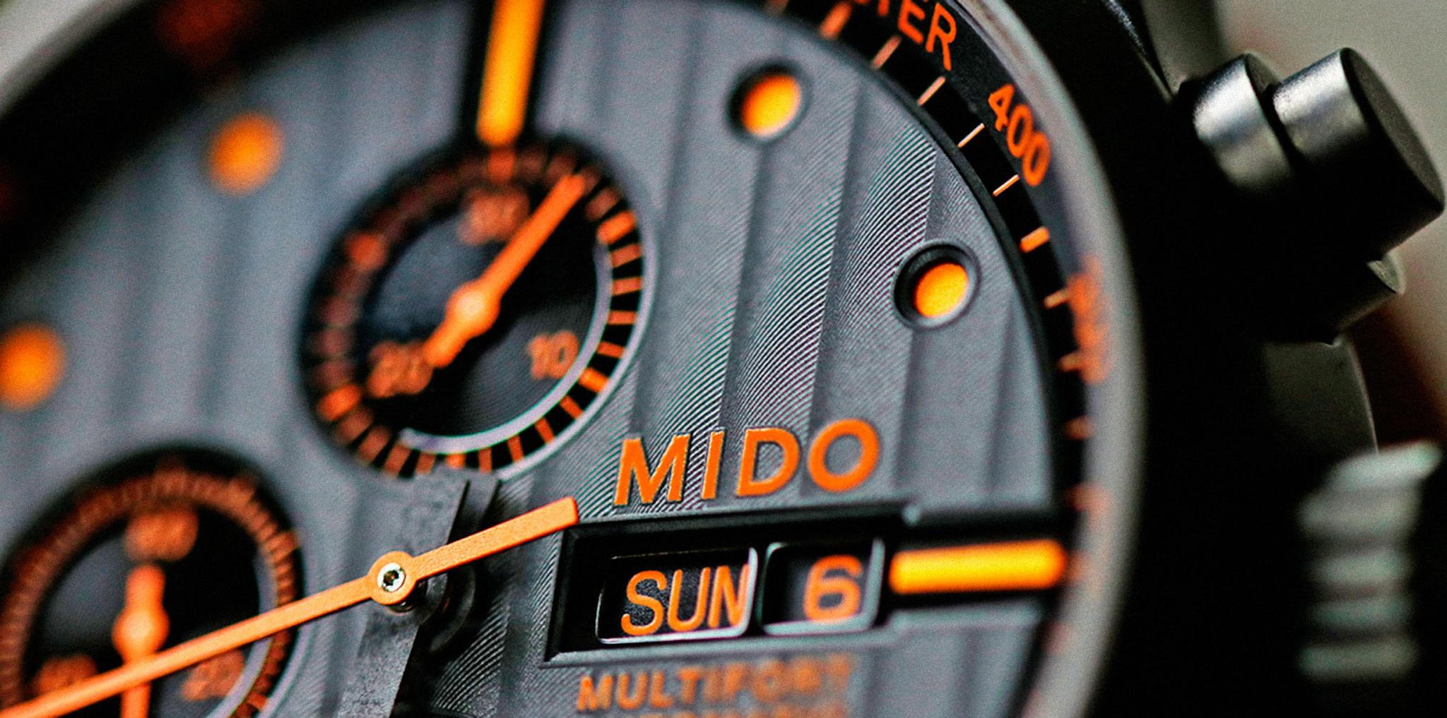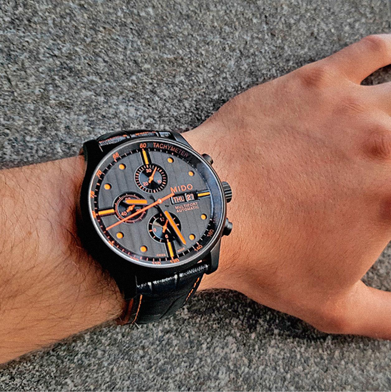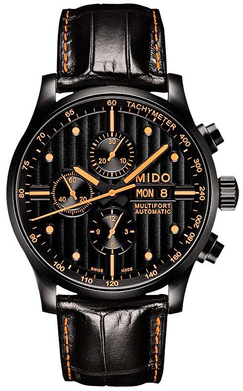 В облике и отделке нового поколения часов Multifort Special Edition Chronograph тоже отразились детали арочных и подвесных конструкций, а часовые индексы оранжевого цвета, фирменного для стиля Mido, напоминают металлические заклепки сооружения. Яркие точки — часовые метки — просматриваются сквозь отверстия в черном циферблате с декором «Женевские волны». На этом темном фоне контрастным оранжевым люминофором отмечены тахиметрическая шкала, разметка накопителей хронографа, индикаторы даты и дня недели, а также все стрелки. 44-миллиметровый стальной корпус с черным pvd-покрытием обладает водонепроницаемостью до 300 м, поэтому механизм автоматического хронографа Mido 1320 (на базе ETA Valjoux 7750) надежно защищен.