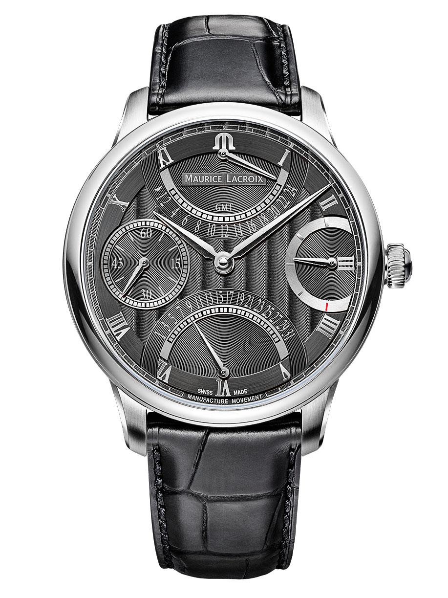 Свои первые часы с двойным ретроградным индикатором компания Maurice Lacroix выпустила в 2003 году, а спустя почти 15 лет предлагает две новые модели в линии Masterpiece. Обе имеют стальной корпус диаметром 43 мм, а их циферблаты поделены на хорошо различимые сектора с разным типом отделки (узор Clous de Paris, Cotes de Geneve, пескоструйная обработка). Часы Masterpiece Double Retrograde, как следует из названия, имеют два ретроградных индикатора — времени второго часового пояса в 24-часовом формате (в верхней половине циферблата) и даты (дуга вокруг отметки 6 часов). Кроме этих двух стрелок на циферблате заметны еще четыре: центральные часовая и минутная, малая секунда (у 9-часовой отметки) и стрелочный индикатор запаса хода (на «3 часах»). Стрелки и разметка на черном циферблате имеют родиевое покрытие, а на серебристом они синего цвета. За слаженную работу всех стрелок отвечает автоматический механизм ML191.