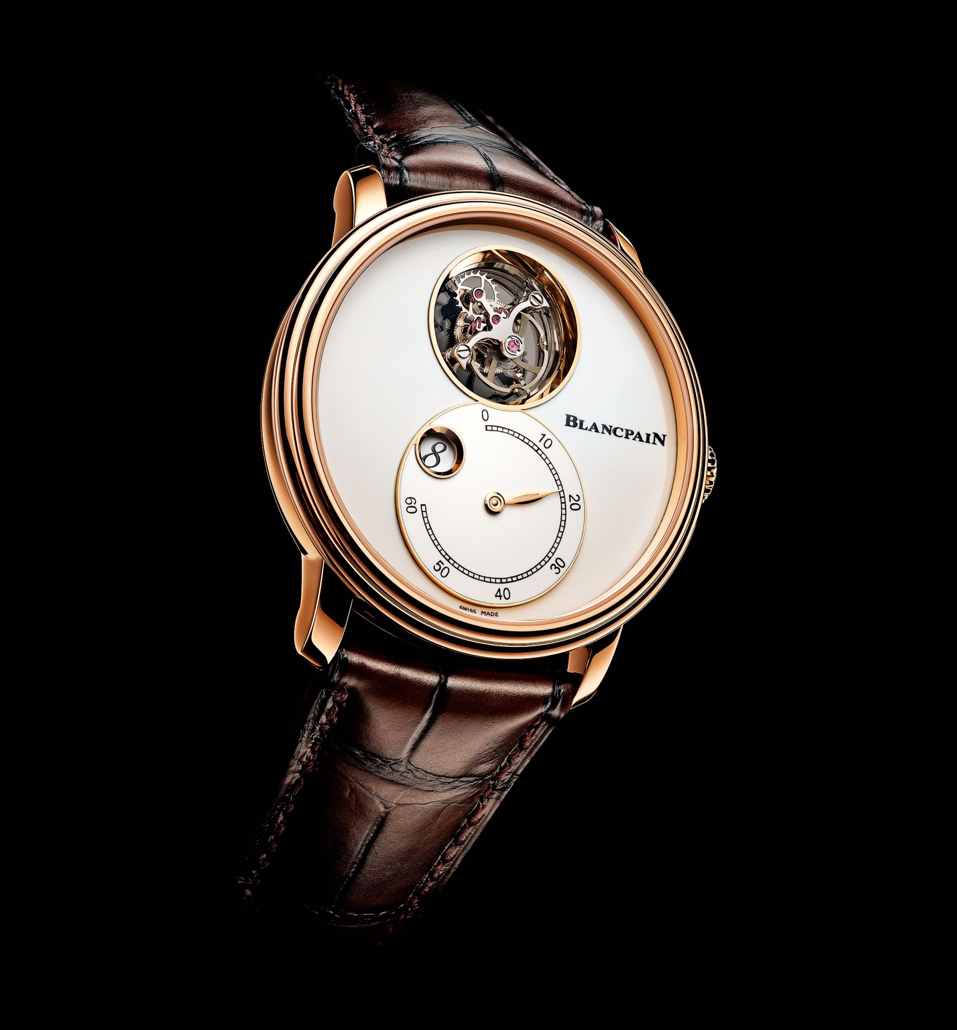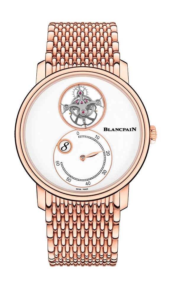 Новые часы Villeret Tourbillon Volant Heure Sautante Minute Retrograde, представленные домом Blancpain на выставке в Базеле, примечательны во многих отношениях. Прежде всего это первые наручные часы, в которых использована функция прыгающего часа и ретроградная минутная стрелка. При этом окошко с прыгающим часом расположено на ретроградной минутной шкале, что позволяет быстро и легко прочесть время. В конце каждого часа меняются показания в круглом окошке, а минутная стрелка мгновенно отпрыгивает назад на 270 градусов, начиная отсчет нового часа. Временная индикация занимает нижний круг «восьмерки» на элегантном минималистичном циферблате, выполненном в технике горячей выемчатой эмали. Но все внимание приковывает «парящий» турбийон. Впервые он появился на наручных часах Blancpain в 1989 году. Сегодня, почти 30 лет спустя, он действительно «парит» в окошке, расположенном в верхней половине циферблата. Дело в том, что нижний мост заменен на прозрачное сапфировое стекло, к которому и крепится каретка турбийона. Поэтому ничто не мешает следить за ритмичным биением сердца часов. Сложный калибр 260 MR с ручным заводом помещен в корпус из красного золота Villeret с характерной двойной «ступенькой». Доступна и платиновая версия в количестве 50 штук.