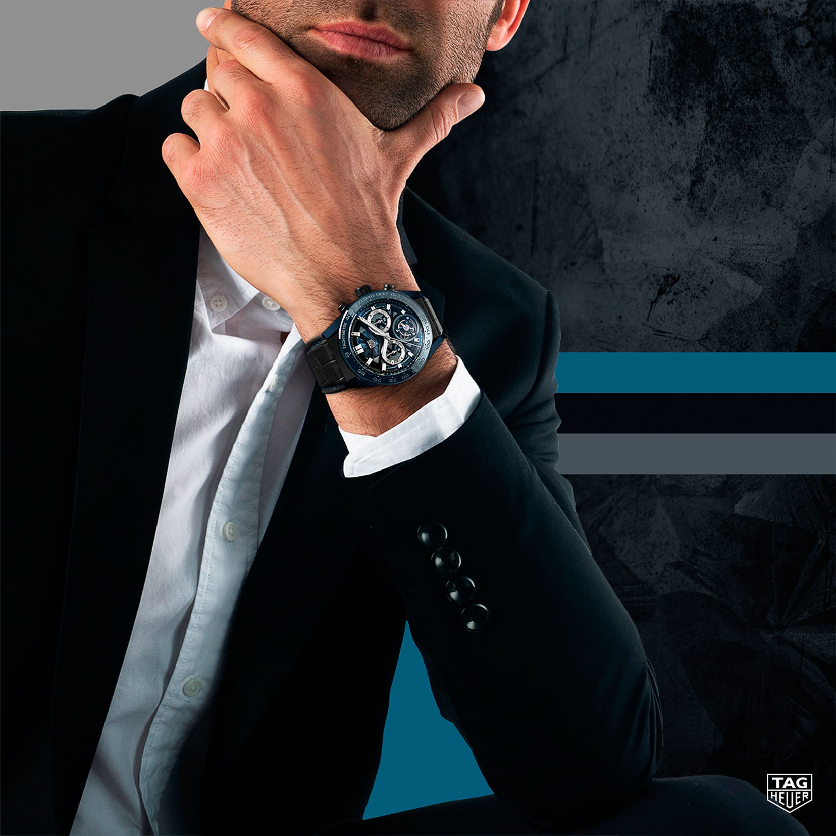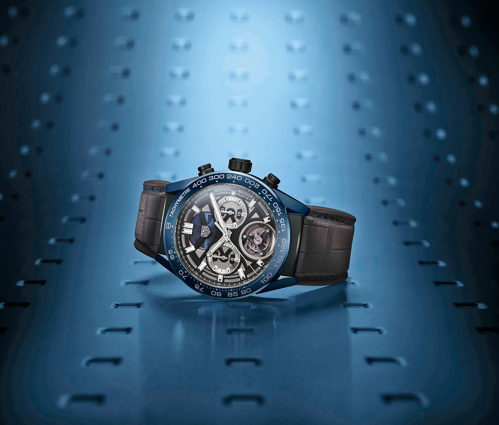Легендарная модель Heuer Carrera была создана Джеком Хоэром в 1963 году и уже более полувека демонстрирует отличные спортивные данные и высокую точность хронографических измерений. К ее пятидесятипятилетию компания TAG Heuer выпустила новую линейку стальных хронографов с калибром Heuer-02, в том числе с функцией GMT. Но статус флагманской новинки, без сомнения, принадлежит эффектным часам TAG Heuer Carrera Heuer Tourbillon в эффектном 45-миллиметровом корпусе из синей керамики. Это не просто хронограф с турбийоном. Это первый сертифицированный хронометр TAG Heuer, причем сертификат получен не от швейцарской лаборатории COSC, а от французской национальной обсерватории Безансона. Ее отличительный знак — голова гадюки (Tête de Vipère) — нанесен на видимый сквозь заднюю крышку мост механизма Heuer-02T. Строгий протокол Безансонской сертифицирующей институции предполагает шестнадцатидневные испытания готовых часов в пяти положениях при трех различных температурах. Выпуск TAG Heuer Carrera Chronographe Tourbillon Chronomètre «Tête de Vipère» лимитирован 155 экземплярами.