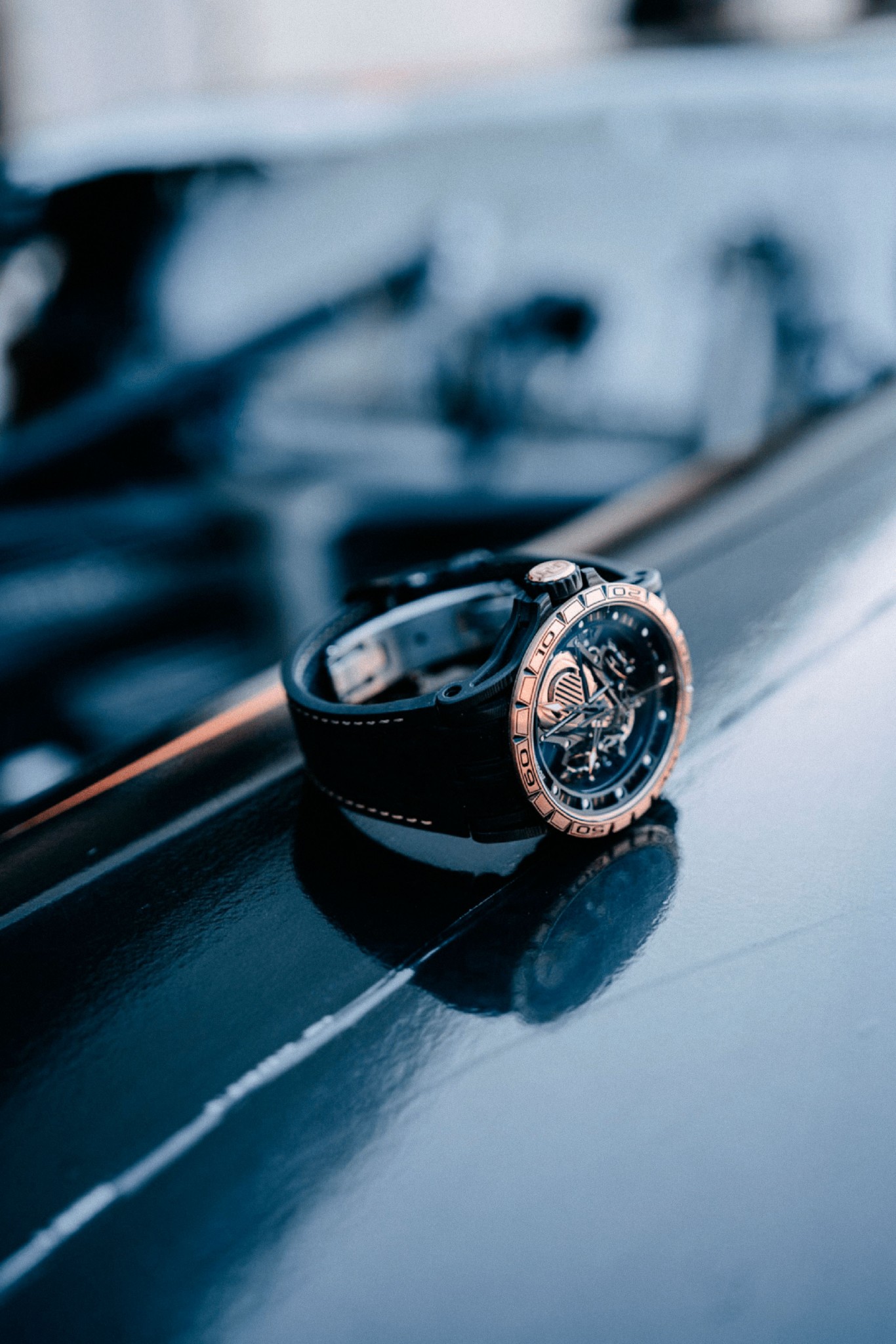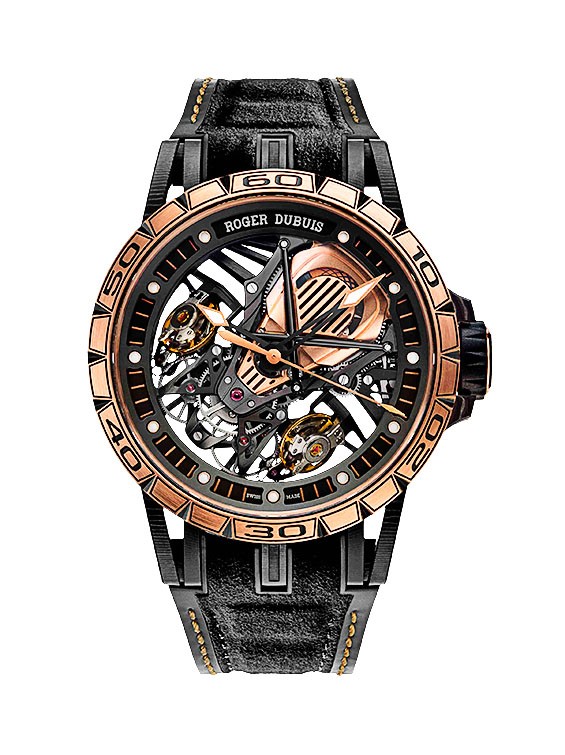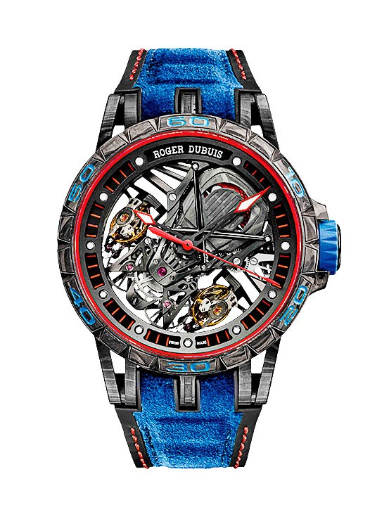 Часовой бренд Roger Dubuis продолжает сотрудничество с подразделением Lamborghini Squadra Corse. Для специальной коллекции, вдохновленной миром высоких скоростей, была выбрана знаковая экстравагантная линейка Excalibur. Вдохновившись авангардной внешностью суперкара Lamborghini Aventador, мастера мануфактуры Roger Dubuis разработали дизайн двух новых спортивных скелетонов Excalibur Aventador S в синей гамме и с элементами из розового золота. Обе ультрафункциональные модели приводятся в действие калибром RD103SQ из 313 деталей. Особенностью механизма является двойной узел балансаспирали Duotor, который располагается на кронштейнах, напоминающих треугольные элементы подвески колес. Как и любой калибр Roger Dubuis, он имеет сертификат «Женевское клеймо». 45-миллиметровый корпус изготовлен из того же самого многослойного карбонового С-SMC-компаунда, который используется в гоночных авто Lamborghini. Корпусное кольцо сделано из титана с литой накладкой из каучука синего или черного цвета (для модели с безелем — из розового золота). Двухцветный ремешок из черного каучука со вставкой из ярко-синей или черной ткани Alcantara снабжен системой быстрой замены. Синий Excalibur Aventador S выпущен в количестве 88 экземпляров, более драгоценная версия доступна лишь в 28 экземплярах.