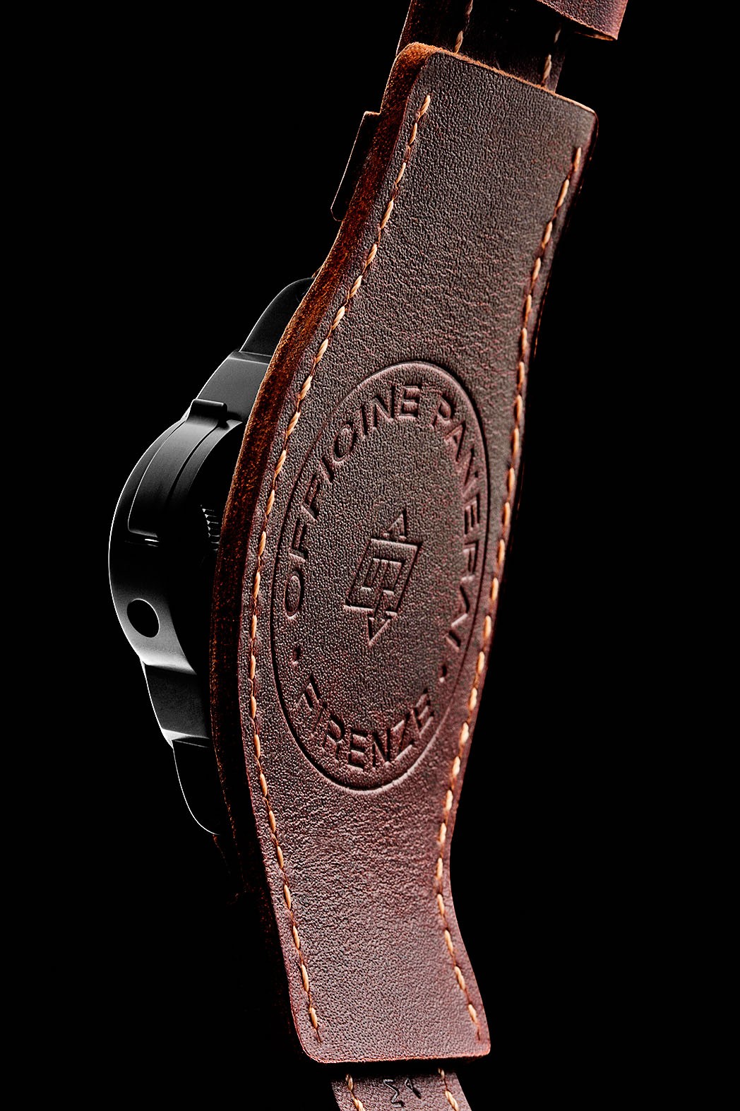 Еще одна деталь облика часов — оригинальный ремешок в военном стиле из необработанной кожи теленка. Его можно носить классическим способом или вместе с широкой манжетой, которая предотвращает контакт задней крышки часов с кожей запястья. Обе части ремешка украшены бежевой прострочкой и логотипом, а на пряжку нанесено DLC-покрытие.
