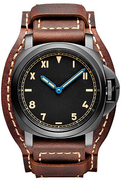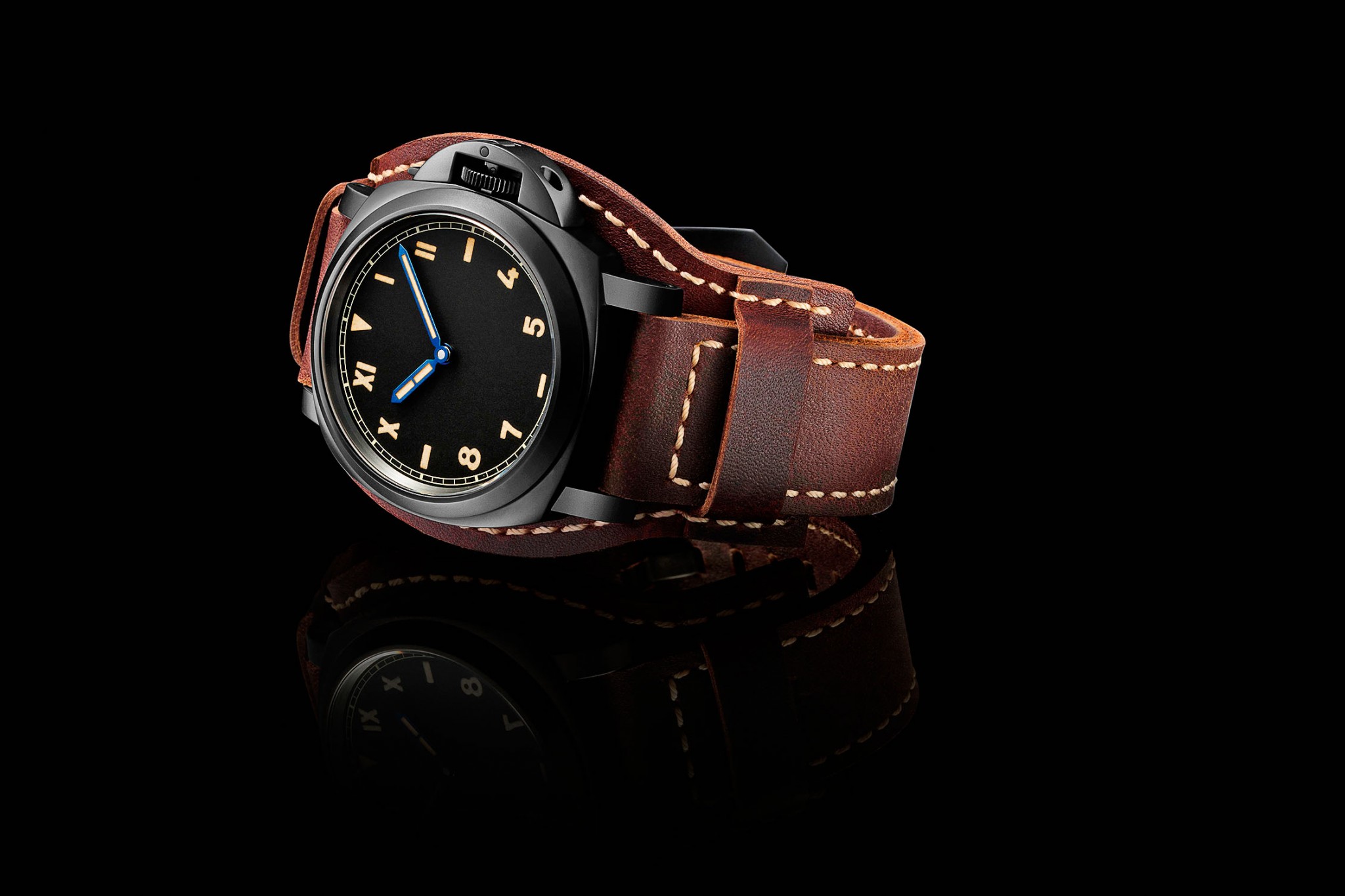 Спустя шесть лет пришло время часам Luminor примерить лаконичный «калифорнийский» циферблат. Между римскими и арабскими метками перемещаются вороненые часовая и минутная стрелки с люминофором. Корпус диаметром 44 мм выполнен из титана с алмазоподобным покрытием DLC — отсюда его красивый глубокий черный цвет с матовым отливом. Устройство защиты заводной головки также обработано DLC, что позволяет часам сохранять герметичность до глубины 300 м и надежно защищать мануфактурный калибр P.5000 с недельным запасом хода.