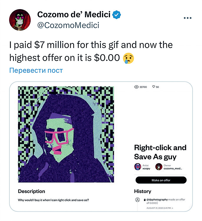 Разумеется, люди тут же принялись заниматься спекуляцией. «Я купил эту гифку за $7 млн, а теперь за нее предлагают не больше $0.00» — такой твит недавно опубликовал Cozomo de'Medici, коллекционер NFT. С начала NFT-бума капитализация цифровых активов, подтвержденных технологией блокчейна, упала до 3% от пикового значения 2021 года. Эту оценку приводят аналитики компании DappGambl, изучившие более 70 тыс. NFT-коллекций, — сегодня 95% из них являются не более чем бесполезными инвестициями.