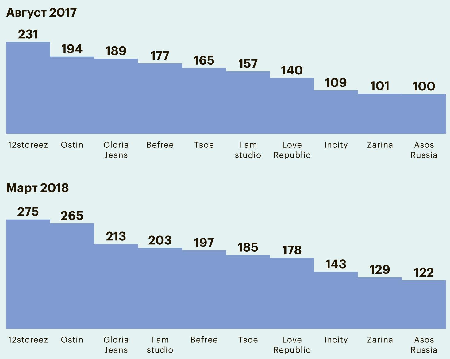 Массовые бренды, которые пришли в соцсети, чтобы не отставать от тренда омниканального присутствия, справляются с этим не так успешно, добавляет она. В рейтинге «Топ-10 официальных сообществ fashion-брендов по количеству подписчиков» на март 2018 года у 12storeez аудитория 275 тыс. человек, у одного из массовых российских брендов Ostin — 265 тыс. человек. «Сравним 12storeez — девять розничных магазинов, Ostin — 636 магазинов», — подчеркивает Гаспарян.