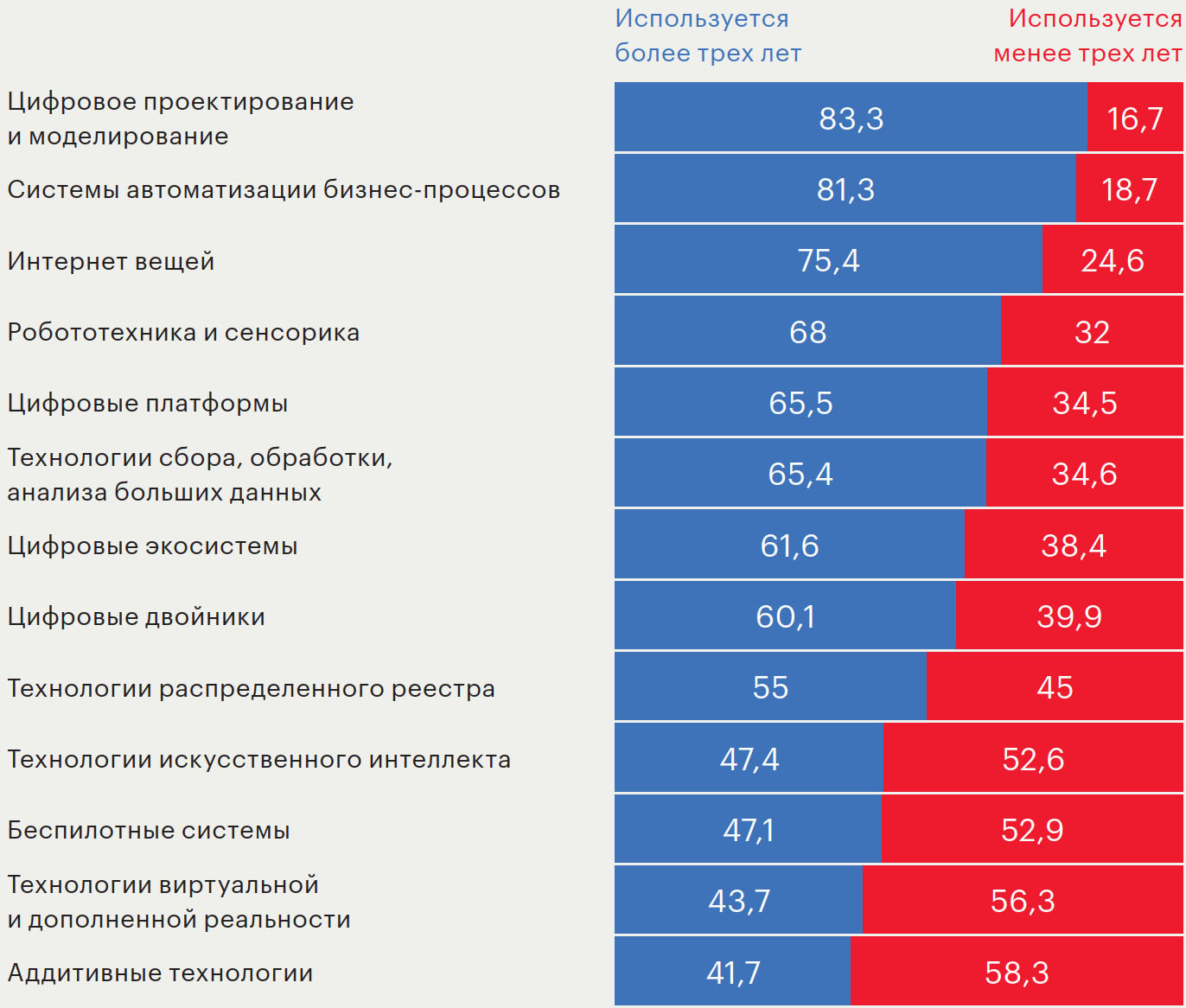 - Для многих организаций внедрение цифровых технологий стало приоритетом еще до пандемии. Относительно давно осваивается цифровое проектирование, автоматизируются бизнес-процессы, развивается интернет вещей. При этом такие технологии, как 3D-печать, виртуальная и дополненная реальность, стали применяться преимущественно в последние три года.