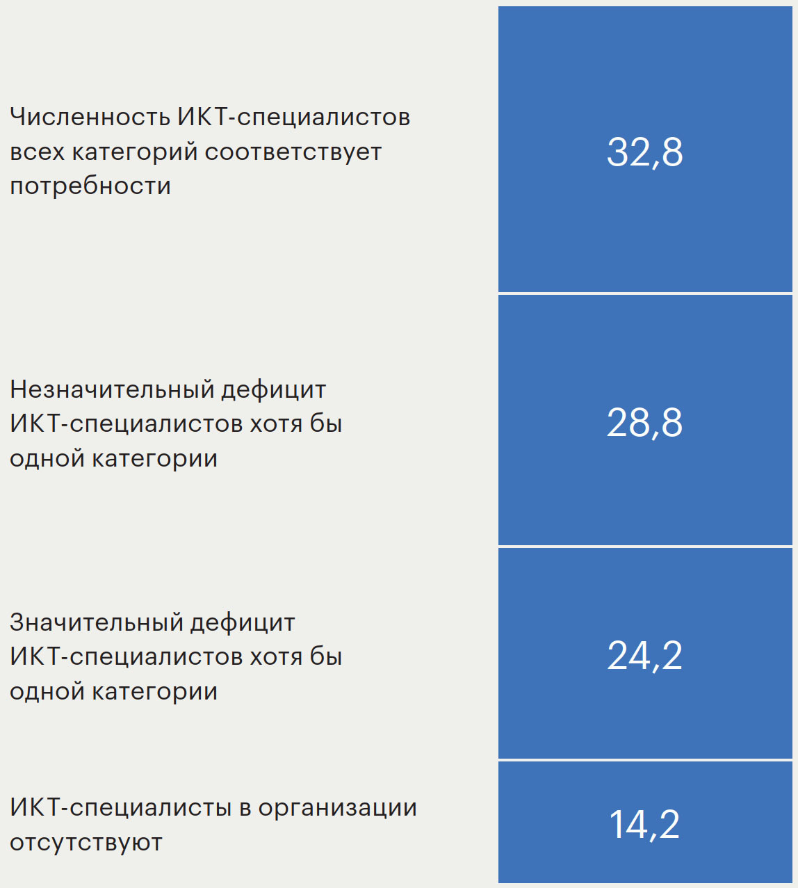 - Почти треть компаний полностью обеспечены необходимыми ИКТ-специалистами. Более половины отмечают их нехватку, в том числе четверть — значительную, оказывающую негативное влияние на функционирование и развитие организации.