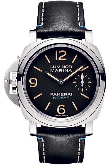 Свою историческую отсылку имеют и Luminor Left-Handed 8 Days Acciaio с левосторонней заводной коронкой, защищенной фирменной скобой. Традиция создания часов для левшей восходит к 1940-м, когда мануфактура снабжала водолазов итальянских ВМС. Калибр P.5001 с ручным заводом можно рассмотреть сквозь прозрачную заднюю крышку, там же расположен индикатор запаса хода. О том, что перед нами «долгоиграющая» модель, гласит яркоголубая надпись «8 Days» на черном сэндвичевом циферблате. Все модели поставляются со сменными каучуковыми ремешками и маленькой отверткой для удобства их замены.