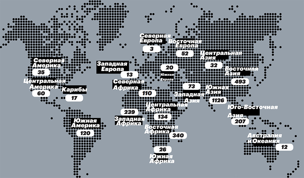 Число людей в мире без доступа в интернет (данные по регионам, млн чел.)