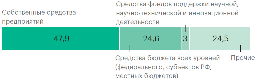 Малые предприятия добавили к затратам крупных и средних организаций на науку еще 3% (45,8 млрд руб. в 2023 году), преимущественно за счет собственных средств (47,9%). Около четверти вложений приходится на бюджетные источники. Оставшаяся четверть — средства сторонних организаций, вузов и иных партнеров. Крупные игроки выполняют исследования и разработки (ИР) в первую очередь за счет бюджетных средств (55% затрат на ИР средних и крупных организаций) — во многом благодаря более активному участию в системе госзакупок, госпрограммах и нацпроектах.
