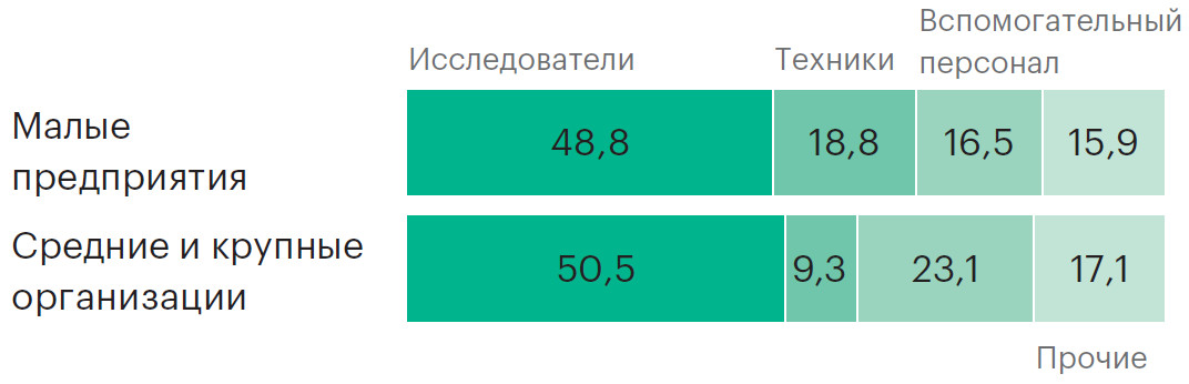 В малых предприятиях наукой занимаются 20,2 тыс. человек (это лишь 3% в сравнении с численностью научного персонала в крупных и средних организациях). Половина из них — исследователи. Значительную долю (18,8%) составляют техники, обслуживающие научные приборы и оборудование. По мнению аналитиков, эта особенность обусловлена отраслевой специализацией (причастностью к сфере производства и информационных технологий) и прикладным характером научных работ.