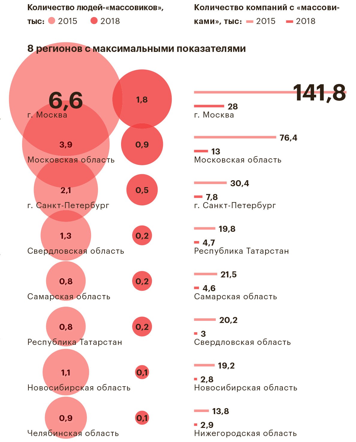 На октябрь 2018-го в России действовало 4,2 млн юридических лиц, из них 132,2 тыс. — с участием «номиналов», а самих «номиналов» — 8,7 тыс. человек, подсчитали аналитики проектного центра «Инфометр» специально для журнала РБК на основании данных с официального сайта ФНС. И это еще сравнительно немного, в 2015 году цифры были гораздо больше: 669,5 тыс. компаний (из 4,79 млн российских юрлиц) и 32,3 тыс. «массовиков» в роли совладельцев или генеральных директоров. Таким образом, если в 2015 году почти 14% российских компаний пользовались услугами «номиналов», то сегодня таких осталось 3,1%. Из-за ужесточения законов бизнес зицпредседателей «съеживается», но не исчезает — как выяснил журнал РБК, он подстраивается под новые требования рынка и успешно выживает.