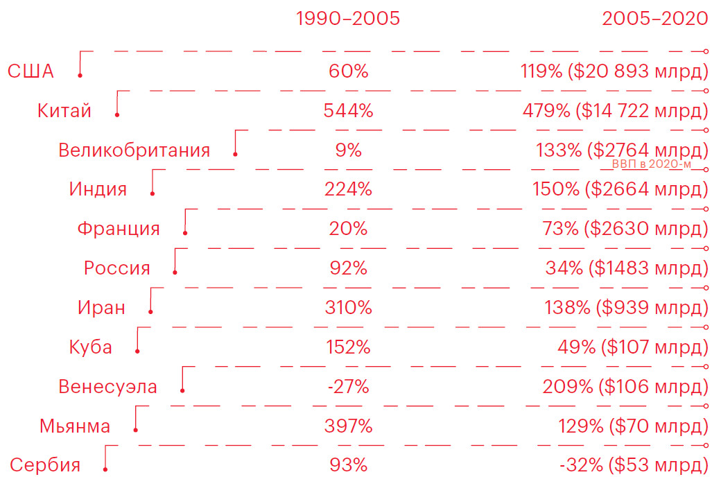 К сожалению, выделить линейную зависимость между макроэкономическими показателями, например динамикой прироста ВВП или ВВП на душу населения, невозможно. Так, если рассматривать динамику ВВП на душу населения, то больше чем на 60% с 2005 по 2020 год выросли Китай ($10 229), Куба ($9478), Индия ($1931), Иран ($11 183), Мьянма ($1292), Россия ($10 166), Сербия ($7656). А с 2014 года положительная динамика по этому показателю наблюдается только у Китая, Кубы, Индии, Ирана, Сербии и США.