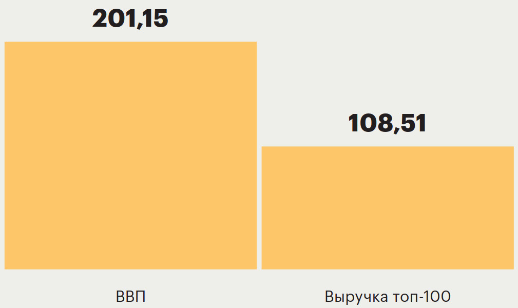 Распределение выручки участников РБК 500 по списку совсем не равномерно и напоминает перевернутую пирамиду — основная масса сосредоточена в верхней части. Уже на 100 первых компаний приходится более трех четвертей суммарной выручки участников рейтинга, и эта величина составляет значение, превышающее половину годового ВВП страны.