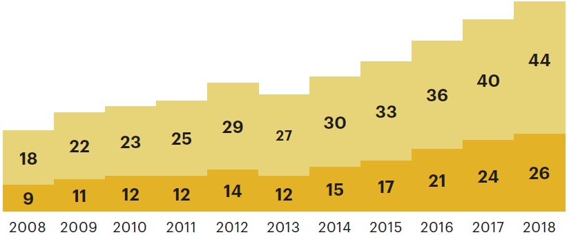 В США в 2018 году 64% жителей в возрасте от 12 лет знали, что такое подкаст, следует из итогов опроса компании Edison Research. «Когда-либо» слушали подкасты 124 млн человек, а регулярно слушать в 2018-м планируют 73 млн, подсчитали аналитики (см. инфографику). В США популярны не только разговорные подкасты, рассказывает Пророков. Например, в популярном Hardcore History журналист и историк Дэн Карлин рассказывает об историческом событии — каждый выпуск длится 4–6 часов, за 11 лет их вышло лишь 60.