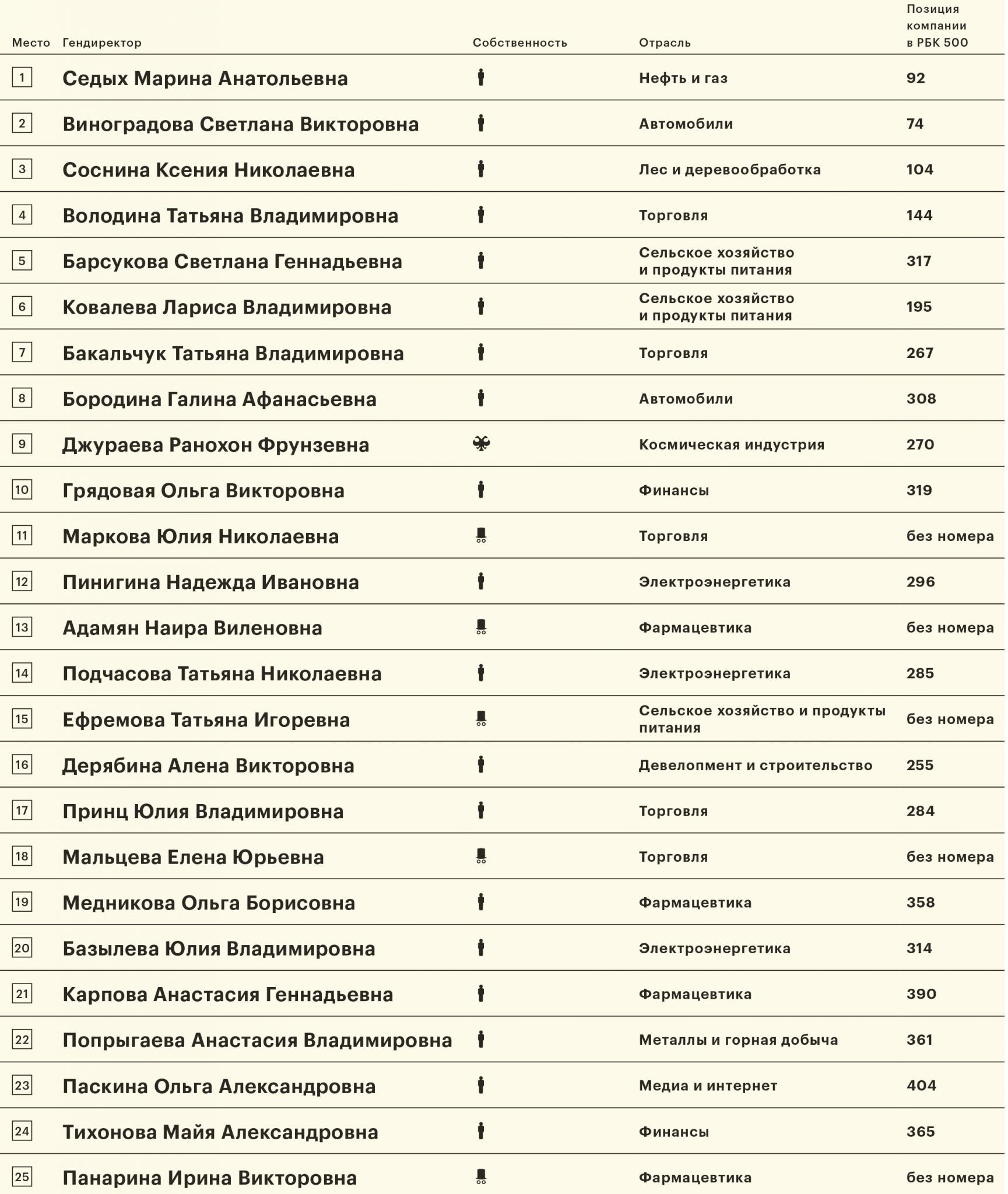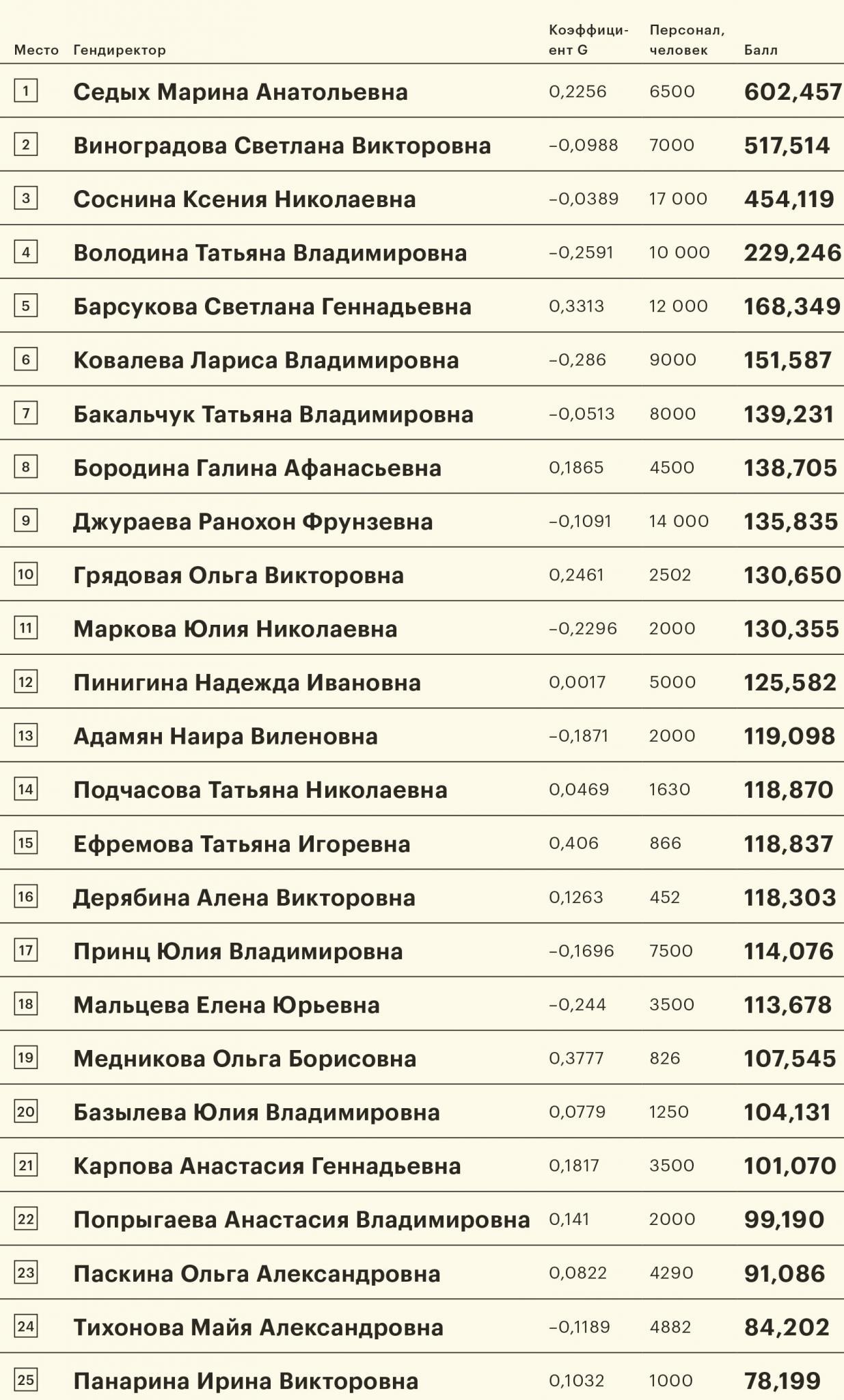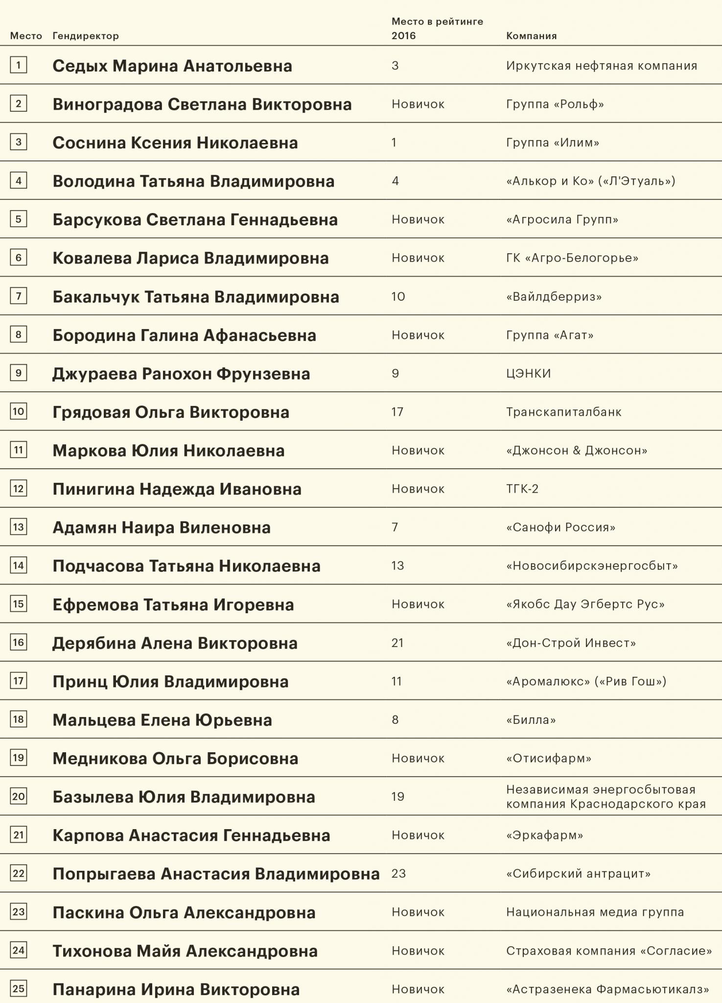 Марина Седых третий год подряд не покидает топ-3 рейтинга, но впервые стала лидером списка. Карьеру начинала юристом на государственных предприятиях, а ИНК руководит с 2000-го. В 2016-м эта компания, один из крупнейших независимых игроков на российском нефтегазовом рынке, нарастила добычу углеводородного сырья по сравнению с 2015-м на 39%, до 7,8 млн т. В июле ИНК отчиталась об открытии двух новых нефтяных месторождений в Иркутской области и перечислении в бюджет региона 6,7 млрд руб. в виде налогов в первые шесть месяцев 2017-го (в 1,5 раза больше, чем за тот же период прошлого года). Седых, которая с 2013-го избирается в иркутский парламент по списку «Единой России», в апреле задекларировала 553 млн руб. дохода по итогам 2016-го — по сравнению с 2015-м сумма выросла почти на 150 млн руб. Forbes оценивает состояние топ-менеджера в $350 млн. Седых руководит собственным благотворительным фондом, в рамках которого поддерживает социальные проекты и развивает бизнес-инкубатор для молодых предпринимателей.