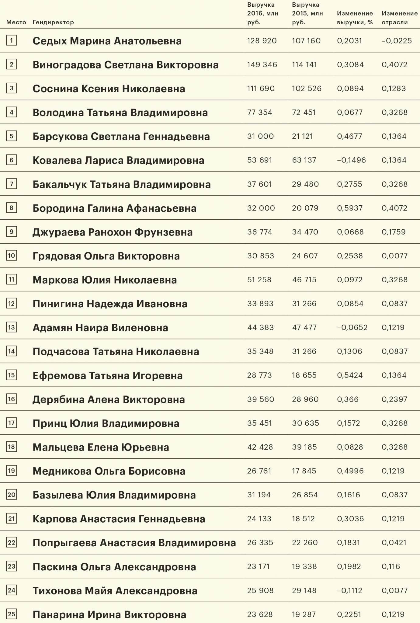 Татьяна Володина третий год подряд не выпадает из топ-4 рейтинга. «Алькор и Ко» — компанию, управляющую крупнейшей в России сетью магазинов парфюмерии и косметики «Л’Этуаль», она возглавляет с 2011 года, до этого продвигала бренды зарубежных производителей Clinique и Shiseido. В 2016-м «Л’Этуаль» впервые за годы руководства Володиной не увеличила число точек: за год сеть сократилась с 931 магазина до 925, следует из расчетов «INFOLine-Аналитики». При этом совокупная выручка бизнеса за тот же период выросла на 10%, до 90 млрд руб., заявляла Володина. Также, по ее словам, увеличилась прибыль компании. В 2017-м «Л’Этуаль» ожидает ускорение роста финансовых показателей, прогнозировала гендиректор. Ее оптимизм подтверждают аналитики: в 2016 году рынок косметики и средств по уходу в России увеличился на 9,9%, до 613,3 млрд руб., в 2017-м может вырасти еще на 7%, до 656,5 млрд руб., подсчитали в Euromonitor International.