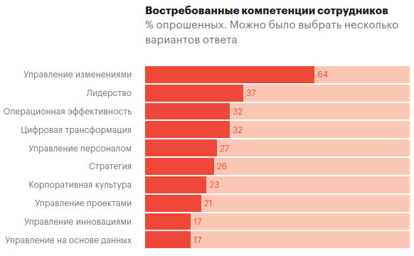 В России актуальные цели руководителей — обучение и развитие сотрудников под новые задачи и вызовы, сохранение ключевых работников и внутренняя коммуникация с командой. А в качестве востребованных навыков называют те, которые помогают поддерживать и развивать бизнес. Большинство из них относится к бизнес-навыкам. Следовательно, российский бизнес планирует в ближайшее время уделять внимание их развитию.