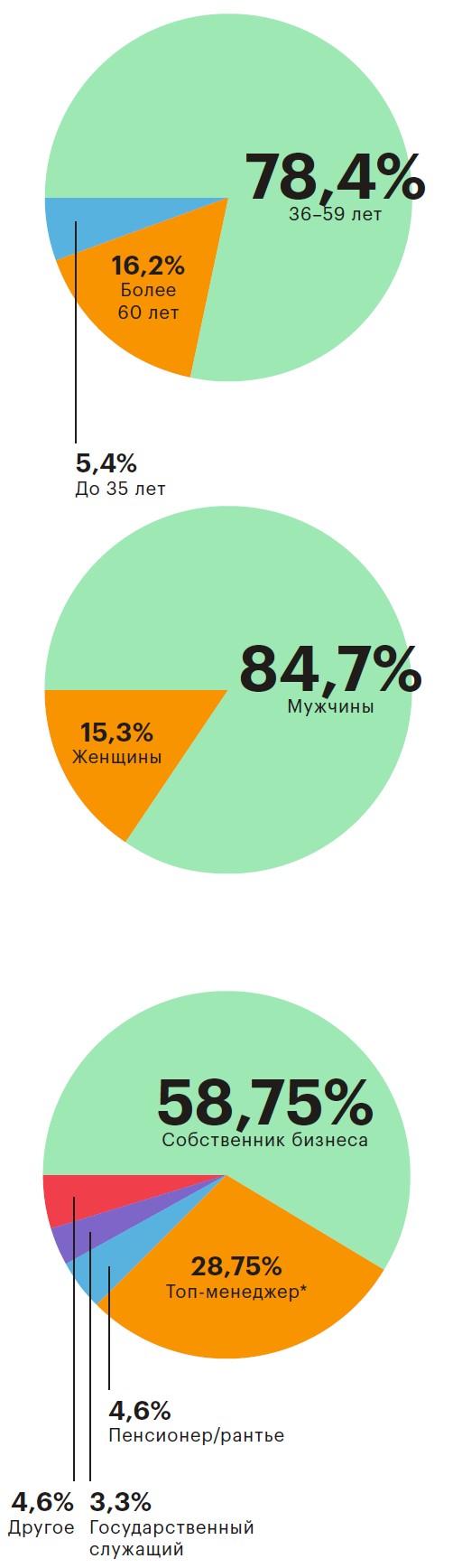 Разделение премиального сегмента и сегмента private banking зависит от конкретного банка, говорит Дмитрий Брейтенбихер. По его словам, оно может носить как внутренний характер — дифференциация доступа к определенным видам продуктов, сервисов и тарифов, — так и внешний характер: отдельное маркетируемое позиционирование и маркетинговая коммуникация для каждого сегмента. «В ВТБ критерием отнесения клиентов к премиальному уровню является доход от 120 тыс. руб., наличие сбережений от 2 млн руб., также есть критерии по транзакционным оборотам по картам. В private banking критерий входа — объем активов от 50ˆмлн руб. в Москве и от 30 млн руб. в регионах. Клиенты являются собственниками компаний, топ-менеджерами или классическими рантье. Средний возраст — 50 лет. 65% всех клиентов — мужчины, 35% — женщины. Помимо классического банковского обслуживания для них важны сохранение и приумножение капитала, организация наследования состояния, юридическое и налоговое сопровождение», — рассказывает эксперт.