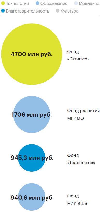 Крупнейшим на сегодня российским эндаументом, по данным CBonds, является фонд «Сколтех», объем которого составляет 4,7 млрд руб. Фонд специализируется на финансировании перспективных технологий. Наибольшая доля рынка находится в управлении «ВТБ Капитал инвестиции» (33,4%). «Сбер Управление активами» замыкает четверку лидеров (в нее входят также «Газпром банк — Управление активами» и «Альфа-Капитал») с долей рынка 13,5%, следует из материалов «Эксперт РА».