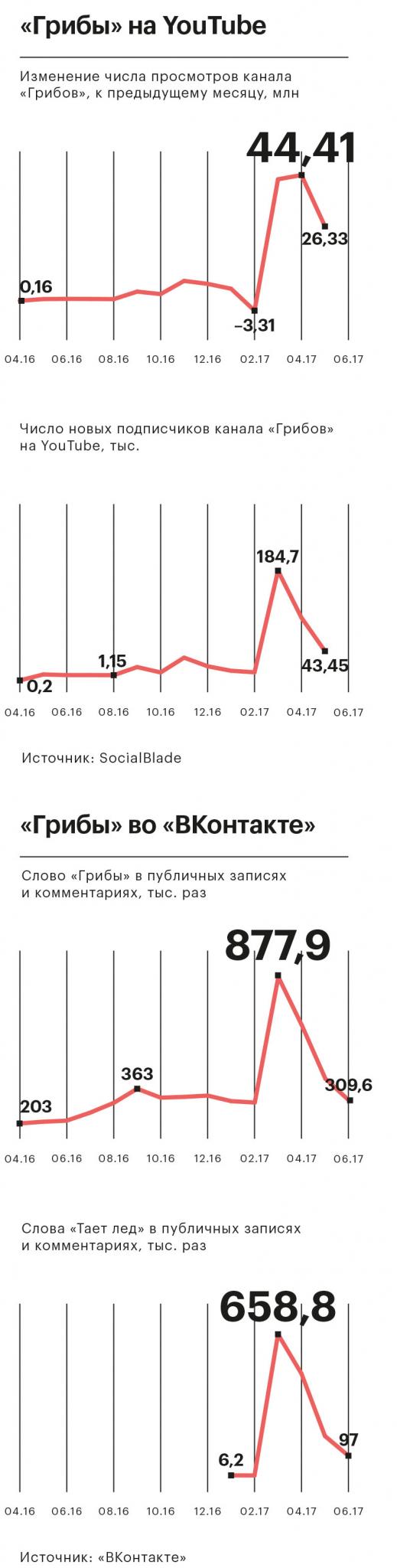 «Тает лед» была выложена 10 марта, и в марте популярность «Грибов» совершила гигантский скачок (см. инфографику). В начале июля число просмотров клипа на YouTube перевалило за 100 млн — три других хита «Грибов», вместе взятые, набрали «всего» 66 млн просмотров.