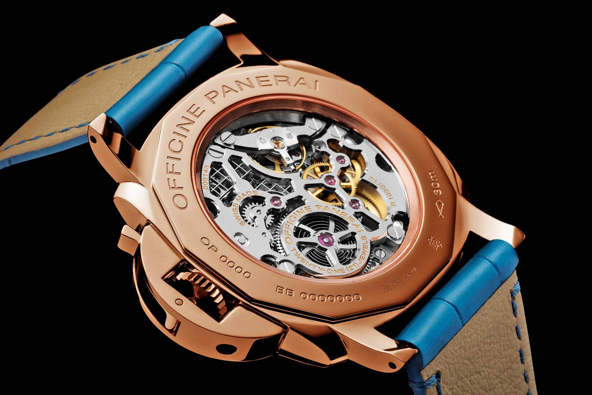 Успешную серию продолжают новинки Luminor Due 3 Days с теми же габаритами и калибром P.1000 с ручным заводом, гарантирующим трехдневный запас хода. Модель из титана имеет синий циферблат «сэндвичевой» структуры с отделкой satiné soleil, а модель в розовом золоте — изысканный, оттенка слоновой кости, на котором контрастно выделяются голубые цифры и часовые индексы, отмеченные люминофором. Особенность модели Luminor Due 3 Days Oro Rosso еще и в том, что с задней стороны механизм версии P.1000/10 скелетонизирован: сквозь сапфировое стекло можно рассмотреть два заводных барабана, обеспечивающих бесперебойную работу калибра в течение трех суток. Обе модели укомплектованы мягкими кожаными ремешками темно-синего и светло -голубого оттенка, которые можно менять самостоятельно нажатием на кнопку под одним из ушек крепления.