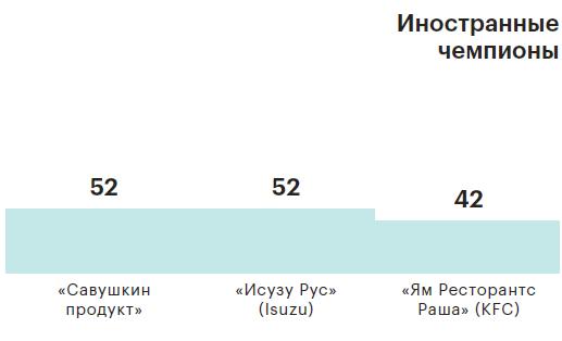 Через сложные фильтры рейтинга прошли 50 российских и 25 иностранных компаний. Это много. Для сравнения: в рейтинге крупнейших компаний рядом с 500 российскими стоят 125 иностранных компаний. Если бы мы включили зарубежные компании в основной рейтинг быстрорастущих, первый иностранец появился бы только на 13-м месте, это была бы компания «Савушкин продукт — Москва», продавец молочных продуктов из Белоруссии, представленных в России как минимум семью различными брендами.