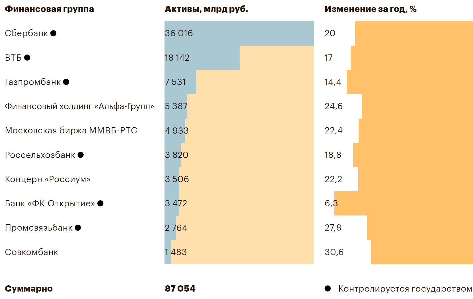 Первое место в рейтинге, как и годом ранее, занял Сбербанк, нарастивший активы на 20%, до 36 трлн руб. Другие участники лидирующей пятерки также не изменились: ВТБ остался на втором месте с активами 18,1 трлн руб., Газпромбанк — на третьем (7,5 трлн руб.), «Альфа-Групп» — на четвертом (5,3 трлн руб.), Московская биржа — на пятом (4,9 трлн руб.).