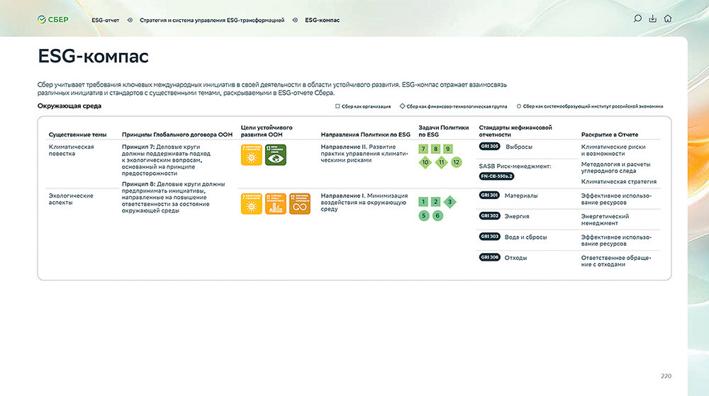 Этой дизайн-тенденции в отчетности начинают активно следовать европейские компании и частично — российские. ESG-компас представляет собой «дорожную карту» в начале отчета. Она иллюстрирует, как компания раскрывает цели устойчивого развития и различные стандарты внутри документа.