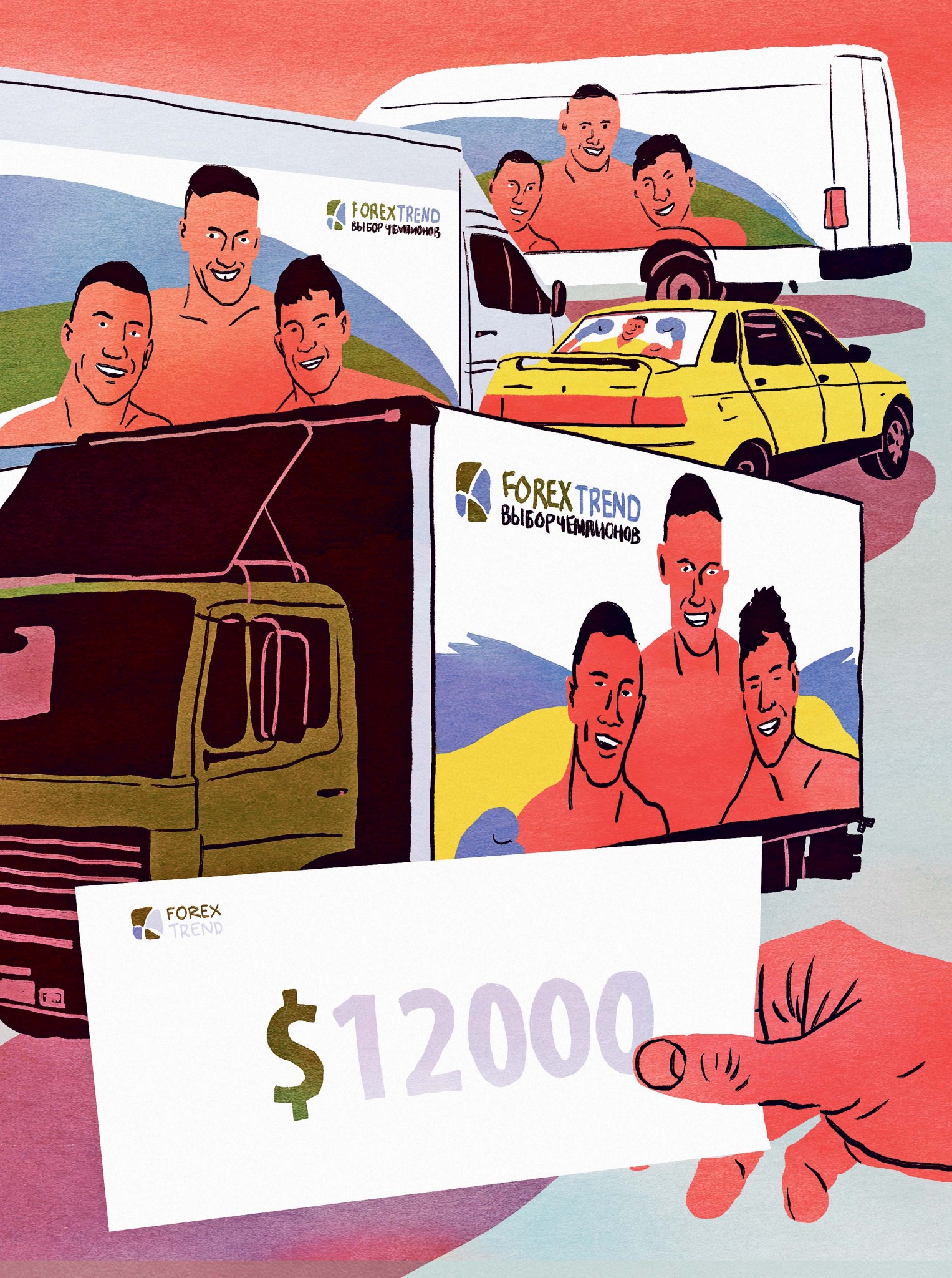 По тому же принципу работала акция «Выбор чемпионов»: украинским водителям дарили сертификаты на $12 тыс. за обклейку машины рекламой Forex Trend. Улицы Запорожья и Днепропетровска заполонили автомобили с фотографией трех мужчин с голыми торсами и в боксерских перчатках с подписью «Forex Trend Выбор Чемпионов».