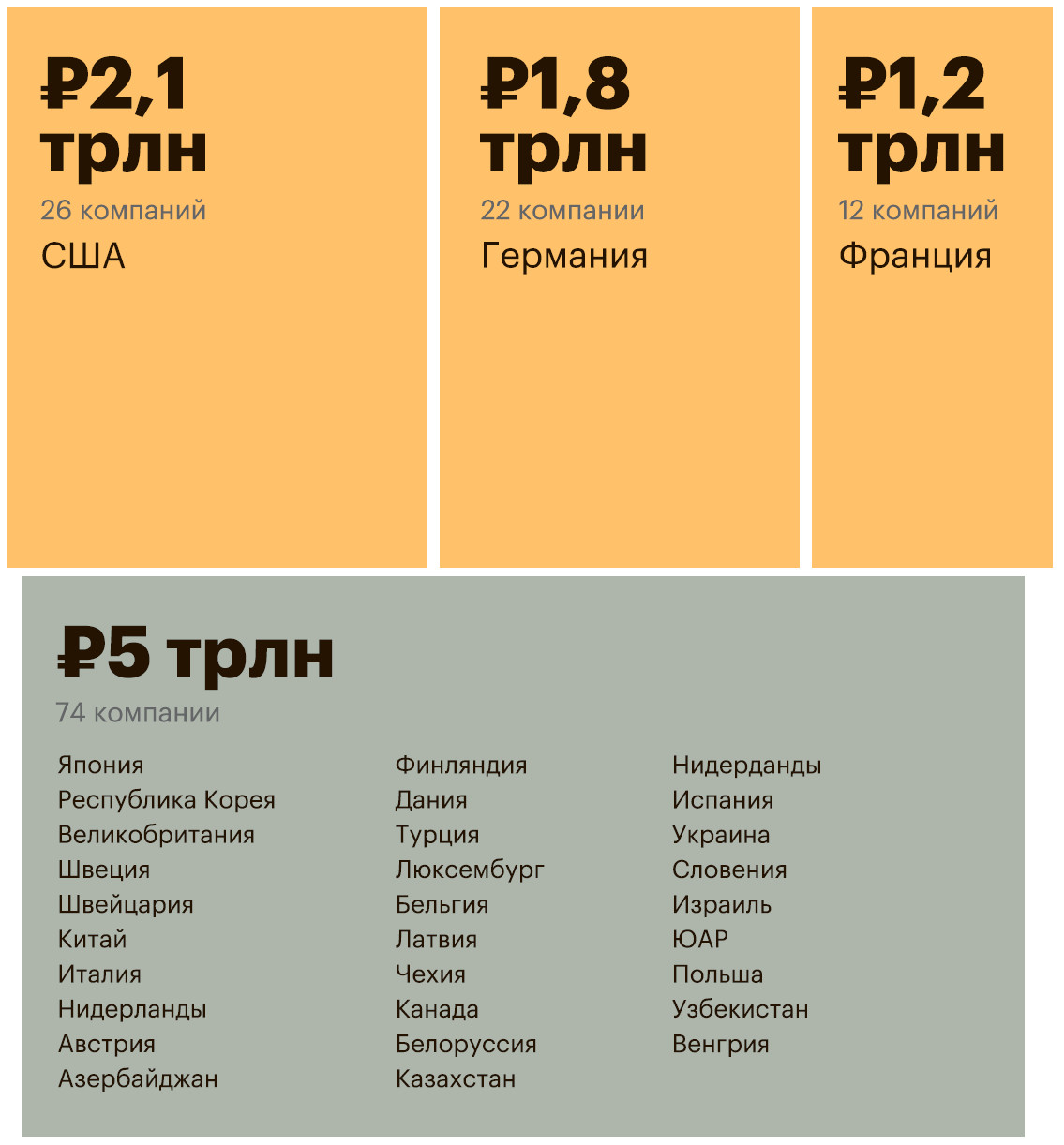 В седьмом рейтинге РБК 500 — представители 32 государств. Однако более половины выручки «иностранцев» (50,3%) приходится на компании всего из трех стран: США, Германии и Франции
