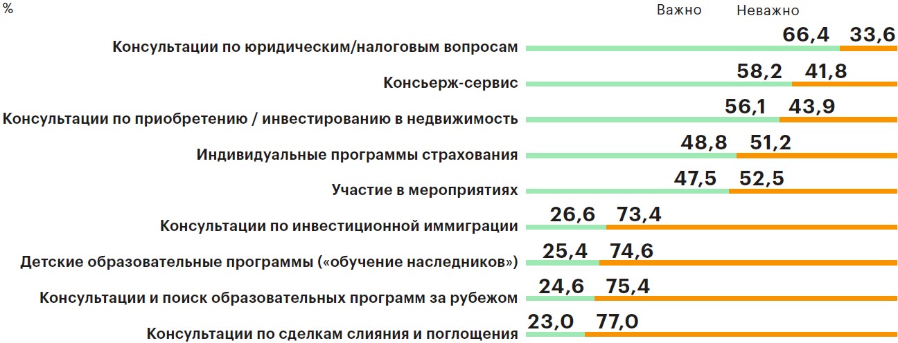 Среди нефинансовых услуг сегодня в центре внимания консалтинговая поддержка. Особенно ценятся качественная экспертиза в налогообложении и юридические консультации, отмечает зампред правления Абсолют-банка Наталья Капинос. С этим выводом согласны эксперты Frank Research Group: чаще всего клиенты РВ с активами от $1 млн обращаются за советами по юридическим и налоговым вопросам, следует из их данных. На втором и третьем местах по популярности — консьерж-сервис и консультации по инвестициям в недвижимость. Из объектов недвижимости при этом, по словам участников рынка, больше всего VIP-клиентов интересуют земли сельхозназначения на юге России и отели в Европе — спокойный низкодоходный бизнес.