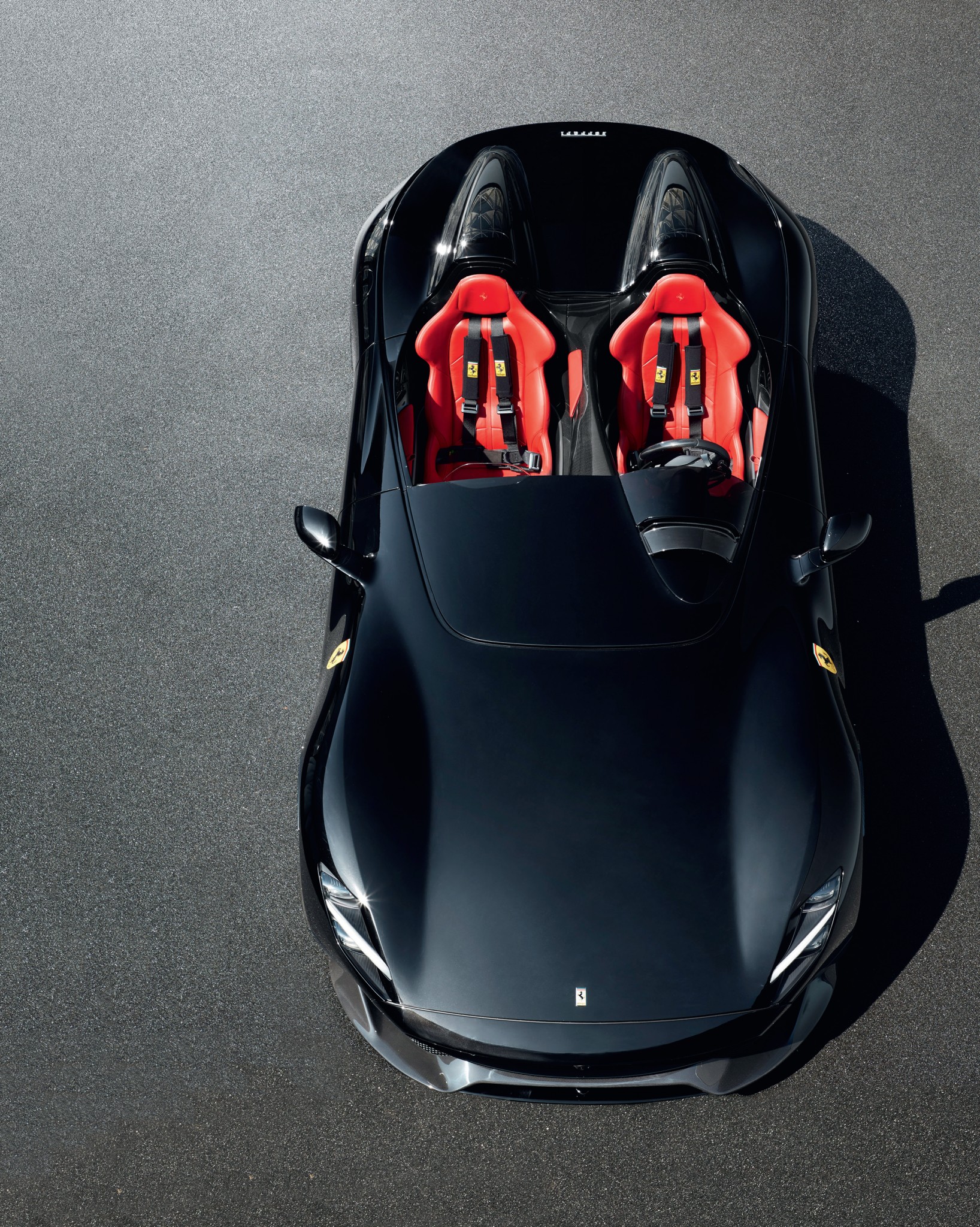 Итальянцы из Ferrari построили двух сестёр Monza SP1 и SP2 на основе купе Ferrari 812 Superfast, но снабдили их оригинальными кузовами без крыши и лобового стекла (так называемыми баркеттами), сделав машины одно- и двухместными соответственно. В дизайне моделей Monza царит суровый минимализм — чистые линии кузова с небольшим количеством изгибов и вырезов. Это создаёт ощущение монолита, окружающего водительский кокпит. Весь кузов, к слову, выполнен из углепластика, он же использован в отделке интерьера. Поскольку лобового стекла нет, инженеры установили над приборной панелью специальный дефлектор Virtual Wind Shield, отклоняющий поток воздуха вверх в обход головы водителя. Зато у пассажира в двухместной модификации стоит небольшое стёклышко. Оформление внутреннего пространства спидстера по-спартански лаконично и полностью соответствует его экстремальному характеру. За сумасшедшую динамику отвечает атмосферный двигатель V12, который развивает 810 л. с.