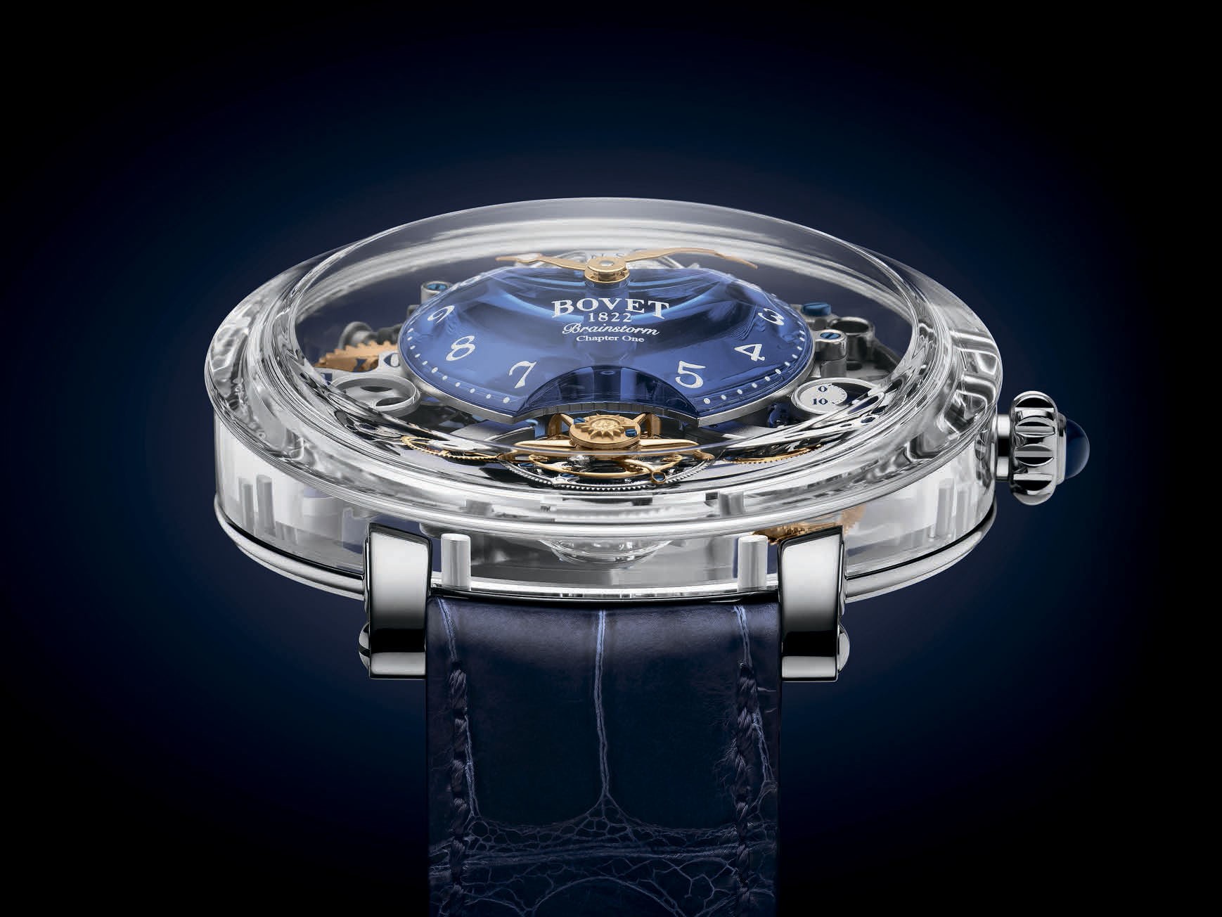 Главная особенность «первой главы» (название намекает на продолжение) — корпус асимметричной (в профиль) формы, которую марка определяет как «письменный прибор». К отметке «12 часов» он утолщается (максимальная толщина — 15,5 мм), так что в центре внимания оказываются сдвинутые от центра полусферические циферблат и индикатор фаз Луны, а к отметке «6 часов», где размещён «парящий» турбийон с секундной стрелкой на каретке, — заметно уплощается. Материалом для корпуса (диаметр 48 мм) стало популярное у производителей сложных часов сапфировое стекло (кольцо задней крышки и ушки ремешка — титановые), позволяющее с любой точки рассмотреть детали мануфактурного механизма с ручным заводом (выпуск лимитирован 60 экземплярами). На лицевой стороне также размещены индикаторы «большой» даты