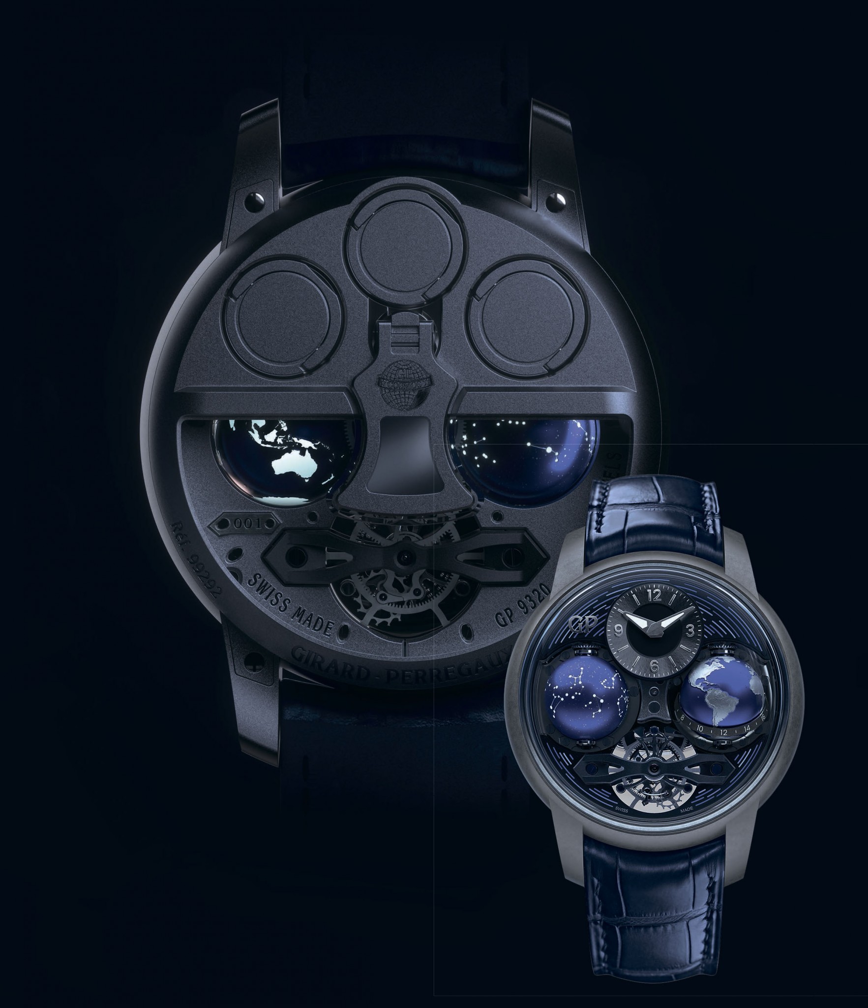 В дополнение к завораживающему зрелищу турбийона, закреплённого по традиции марки на мосту, новинка предлагает редкую возможность одновременно взглянуть в космос с Земли и на Землю — из космоса. Левая сфера с изображениями 12 созвездий, символизирующая небо свод, делает полный оборот за одни звёздные сутки (на 4 минуты короче традиционных, измеренных по Солнцу); правая, в виде глобуса — показывает время второго часового пояса в 24-часовом формате. Заводная коронка отсутствует, настройка часов выполняется четырьмя встроенными ключами на внутренней стороне корпуса (видны на верхнем фото). Механизм с ручным заводом с 60-часовым запасом хода помещён в крупный титановый корпус диаметром 47 мм и толщиной 22,32 мм.