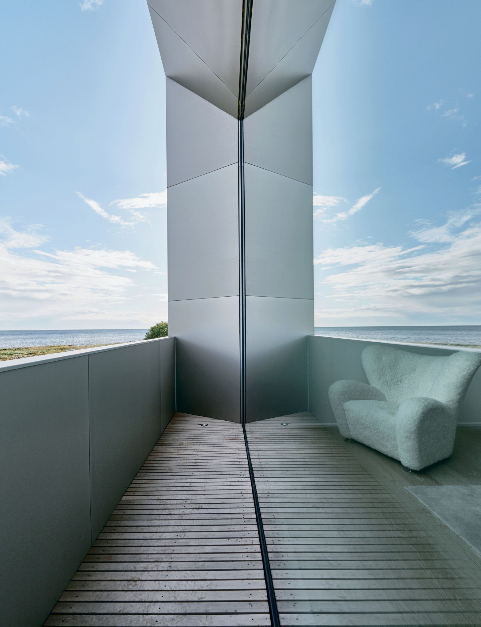 Постройка состоит из простых геометрических объёмов, соединённых таким образом, чтобы продлить вид на море. На первом этаже расположились большая открытая кухня и столовая, немного в стороне — гостиная/библиотека и три детские спальни плюс ванная. Чёрные ступени лестницы, словно паря в воздухе, ведут на второй этаж, территорию взрослых — здесь спальня с морем в окне и светлая ванная. Балкон дополняет сходство с номером в дизайнерском отеле.