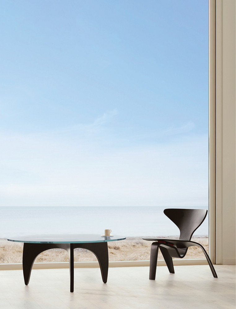 В результате кресло с низкой посадкой PK0 на трёх ножках вышло ограниченным тиражом 600 экземпляров в 1997 году, а журнальный столик PK60 со стеклянной столешницей и изящно изогнутым основанием так и не был запущен в производство. Теперь минималистичный дизайн, демонстрирующий технику гибки паром, снова в деле. Оба предмета выполнены из окрашенного в чёрный цвет ясеня и орегонской сосны, а кресло украшено эффектными красными резиновыми прокладками. Цены по запросу