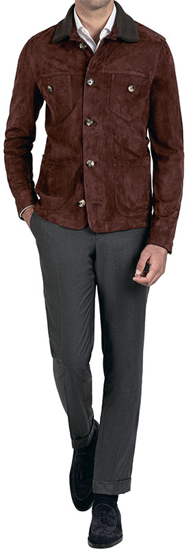 Скромная спецовка французских рабочих, которую англосаксы называют chore coat, давно вошла в пантеон мужской моды. Благодаря своим характеристикам — прямому покрою, рубашечному воротнику, пуговицам и накладным карманам — она стала стильной альтернативой спортивной куртки. Прелесть chore coat в её универсальности. Наденьте её вместо пиджака — и получите бизнес-кэжуал. А с футболкой и чиносами она подойдёт для уик-энда. На рынке есть варианты из вельвета, канвы и денима, но мы выбрали роскошную куртку Isaia из замши, тонированной естественными красителями. Отсутствие подкладки придаёт ей фирменную неаполитанскую лёгкость.
