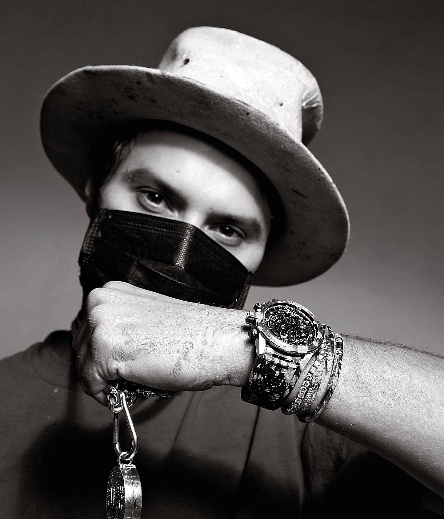 Художник предпочитает появляться на публике исключительно в шляпе и с банданой на лице. Привычка граффитиста, ставшая частью имиджа арт-консультанта?