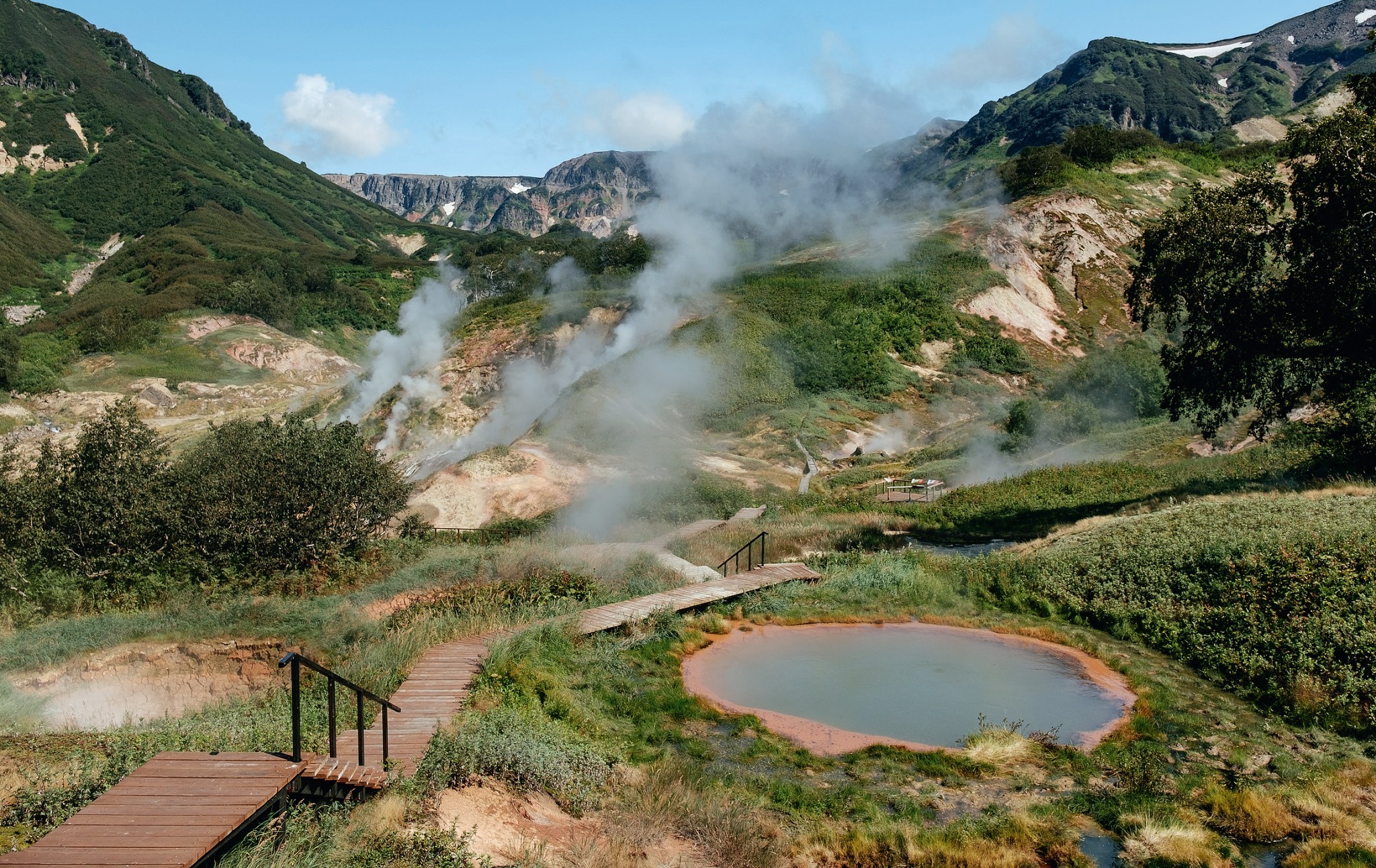 О медведях нам кое-что рассказал рейнджер (он же егерь) Александр Хачукаев во время осмотра Долины гейзеров в Кроноцком заповеднике. До неё примерно час лёту через вулканы и сопки на вертолёте Ми-8, этот трюк в лётную погоду проделывают пилоты авиакомпании «Витязь-Аэро» (она же занимается вертолётными экскурсиями в Камчатском крае, взлетая с одноимённого аэропорта). На Хачукаева стоит подписаться в инстаграме (@alexandr_khachukaev), листать дневник егеря с журналистским образованием крайне занимательно. Начал он с предупреждения: перемещаться по долине можно только по дощатому настилу, сходить с него строго запрещено. Это чревато и для человека, и для природы. К тому же именно здесь нам дали понять, как человек загаживает всё, к чему прикасается. Например, в 1963 году сюда проложили всесоюзный туристический маршрут №264, и к 1977-му в долине реки Гейзерной экообстановка сложилась катастрофическая. Вспомнилась фраза о том, что наша задача, придя в этот мир, не изменить его, а оставить после себя прежним. За этим рейнджеры следят сегодня жёстко. Так же ревностно, как за ними следят медведи. В какой-то момент прогулки среди шипящих гейзеров замечаем на настиле грязные медвежьи следы. Следы кажутся бутафорскими, уж больно они огромные и чётко очерченные. Такие сомнения Хачукаев называет реакцией «кондиционированного мозга белого человека». Егерь показывает выломанные доски из этой дорожки далее по курсу: под настилом спал медведь. Просыпаясь, он то ли так активно чешет спину, то ли просто встаёт и забывает, что у него крыша над головой, в общем, удобное для ночлега укрытие к утру становится тесным. Вот так и живут: медведи ломают, рейнджеры приколачивают. Жизнь. С тропы нельзя сходить и из соображений безопасности, чтобы не обвариться в грязевом или водном котле, где температура может быть около 85 ˚С. Обычно медведь выбирает место поблизости и отпаривает в этой жиже лапы, но бывают случаи, когда зверь соскальзывает в котёл и погибает. Шипящая-шкварчащая Долина гейзеров граничит и с Долиной смерти, где концентрация яда в испарениях предельная. Мы идём дальше и натыкаемся на кучу на помосте. Рейнджер вежливо просит не вляпаться — его не волнует чистота московских лубутенов: в заповеднике всё должно оставаться таким, как создала природа, и если уж медведь оставил здесь «след», убирать его нельзя. «Китайские туристы всё время порываются утащить мишкины какашки. Не понимаю, зачем, но делать это запрещено». Среди прочих наблюдений за царём российской природы, которыми делится егерь, отмечаешь, что медведь крайне смекалист: например, если он быстрее других особей доберётся до шишек, в которых в этой местности полно растительного жира, то вполне обойдётся без ловли рыбы — к чему лишние движения? Рейнджер развеивает пару мифов. Якобы у медведя плохое зрение — это не так. Когда лежит снег и в поле зрения нет особых препятствий, зверь разглядит человека и за 500 метров, а «подслеповатость», о которой говорят наблюдатели, сказывается в том, что большую часть времени зверь проводит, разглядывая растения с расстояния 20–30 см, поэтому сразу же сфокусироваться на далеко расположенной фигуре ему тяжело. Другой миф раздули художники: будто в боевой стойке медведь поднимается во весь рост. Это чушь, зверь атакует из устойчивого положения — всегда на четырёх лапах. Это 